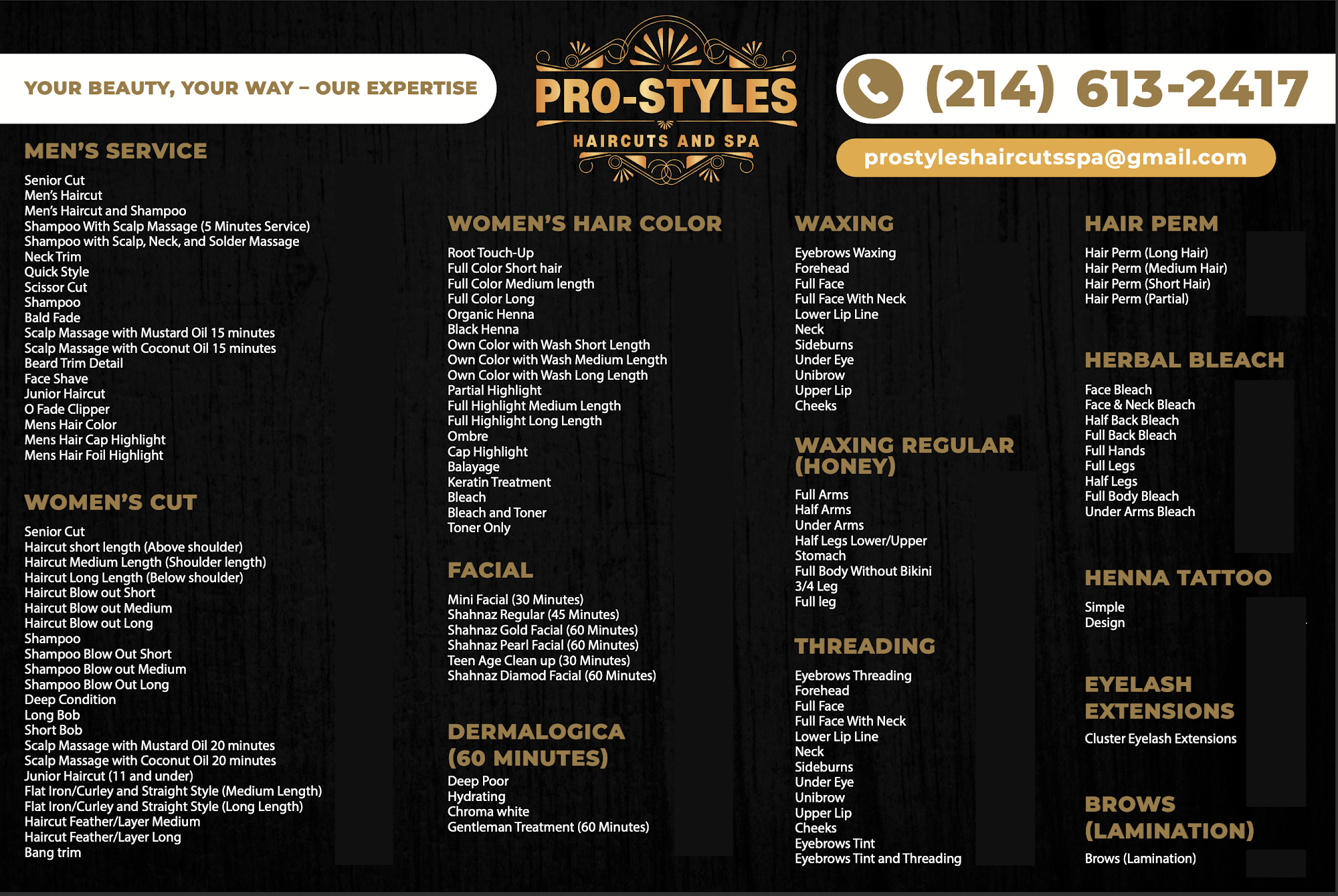 Discover excellence at Pro-Styles Haircuts and Spa. We offer premier beauty services including expert haircuts, styling, coloring, facials, waxing, and eyebrow services. Our experienced team is dedicated to crafting exceptional results tailored to your unique style and preferences. Visit us today and experience the difference at Pro-Styles Haircuts and Spa.