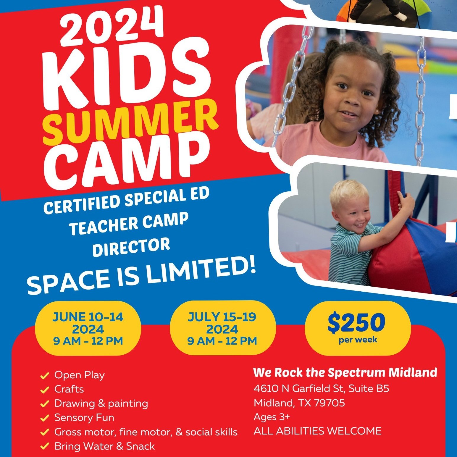 We provide a place for children of all ability levels to play and grow together. As the only kid’s gym in Midland that offers an inclusive philosophy we have found all children can benefit from our uniquely designed sensory equipment that is specifically designed to aid children with sensory processing disorders.