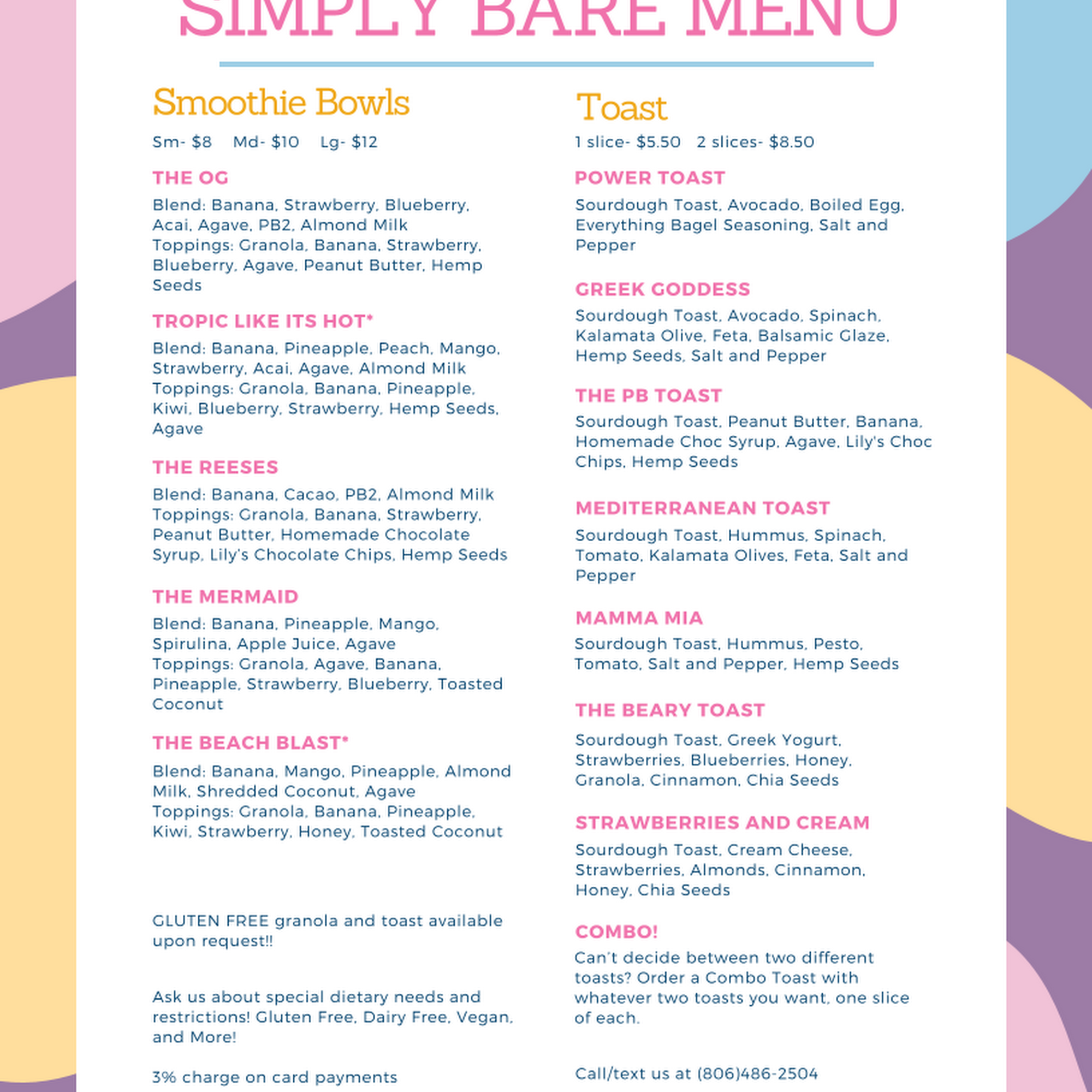Simply Bare is a small, friendly food business offering healthy and delicious options like smoothies, toasts, and bowls. Customers love their fresh ingredients, especially the smoothies and toast, which are considered the best around. The menu includes favorites such as the OG bowl, Greek Goddess toast, and various toast options like beary toast, power toast, and mamma mia toast. Many reviews highlight the friendly service and welcoming atmosphere, with staff being kind and accommodating. The food is praised for being fresh, tasty, and suitable for gluten-free diets. Kids enjoy the offerings too, making it a family-friendly spot. People traveling through small towns often stop by and find it a pleasant surprise. Overall, Simply Bare is appreciated for its high-quality, healthy choices and friendly service, making it a favorite for those seeking a quick, nourishing bite.