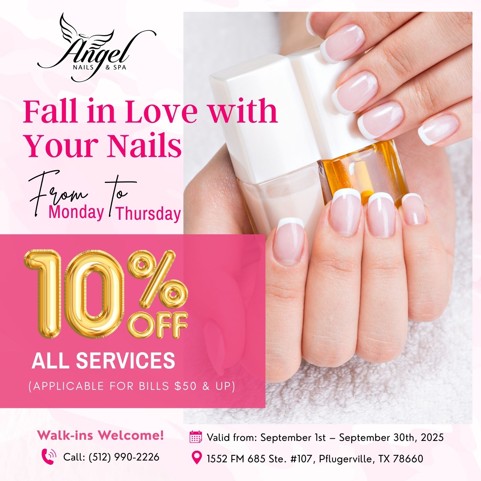 Angel Nails & Spa is proud to be one of the best nail salons, located conveniently in Pflugerville, TX 78660. At our nail salon, clients could enjoy a luxurious & comfortable atmosphere at a reasonable price! Come to visit our nail salon, you’re ensured to experience the best services at a reasonable price as well as an airy and clean space. Come here with us, you can choose from a range of our services such as Manicures, Pedicures, Waxing, Threading, Eyelash Extensions, Eyebrow Tinting and so much more. No matter what services you choose, our experienced technicians will bring you the most satisfaction ever Come to us now and enjoy the relaxing moment.
