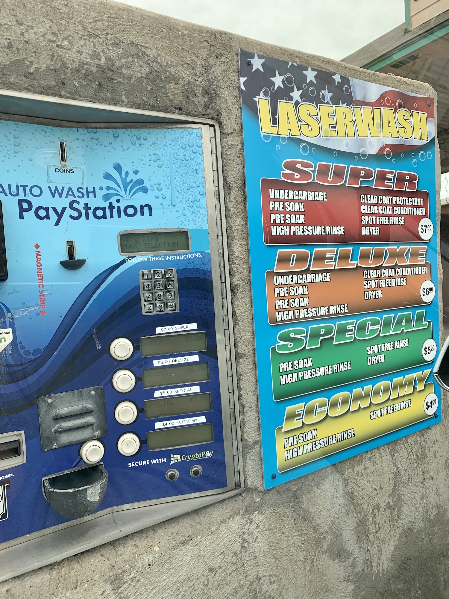 Auto King Car Wash is a very busy place that is easy to access. The automatic wash is very cheap, with a top wash for only $7. The wash does alright and can get a vehicle squeaky clean, with all necessary products and services available. However, the machine is about to bite the dust and had a real concern of getting stuck. The self-service vacuum cleaners barely work and are a waste of money, with garbage everywhere making it very dirty. The brush hose can be torn and the clear coat clogged. The ownership are wonderful, very kind and courteous. They allow fundraisers, but the lot can be occupied by people not washing their cars. In summary, some would go elsewhere unless you are a cheap freak.