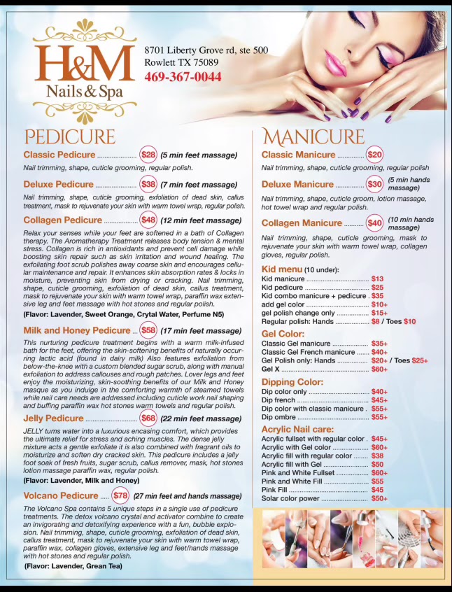Welcome to H&M Nails & Spa, your premier destination for relaxation and beauty at 8701 Liberty Grove Rd, Ste 500, Rowlett, TX 75089. Our experienced team provides top-notch nail care, spa treatments, and beauty services in a tranquil and inviting environment. We pride ourselves on using high-quality products and the latest techniques to ensure you leave feeling rejuvenated and beautiful. Whether you’re looking for a manicure, pedicure, or a luxurious spa day, H&M Nails & Spa is dedicated to exceeding your expectations. Visit us today or call 469-367-0044 to book your appointment. Your satisfaction is our priority!