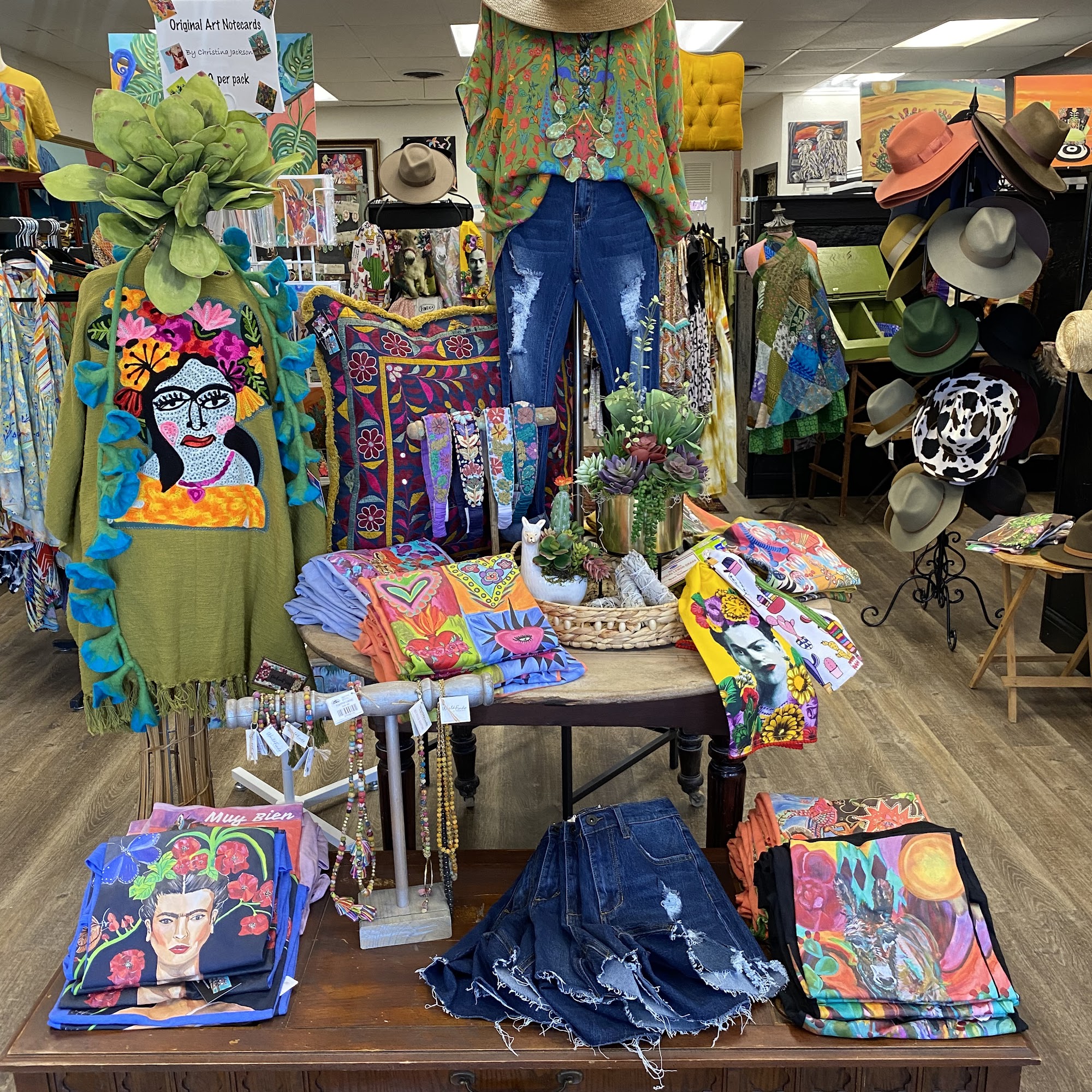Come have fun, shop and color your world with original art by Christina Jackson! You will find unique ladies apparel in sizes xs-3xl, fair trade jewelry, interesting Home accents, and much more! Original art tees, pillows, notecards, pouches, aprons, shoes and more make gift giving a breeze! A relaxing shopping experience with knowledgeable staff offering friendly customer service.