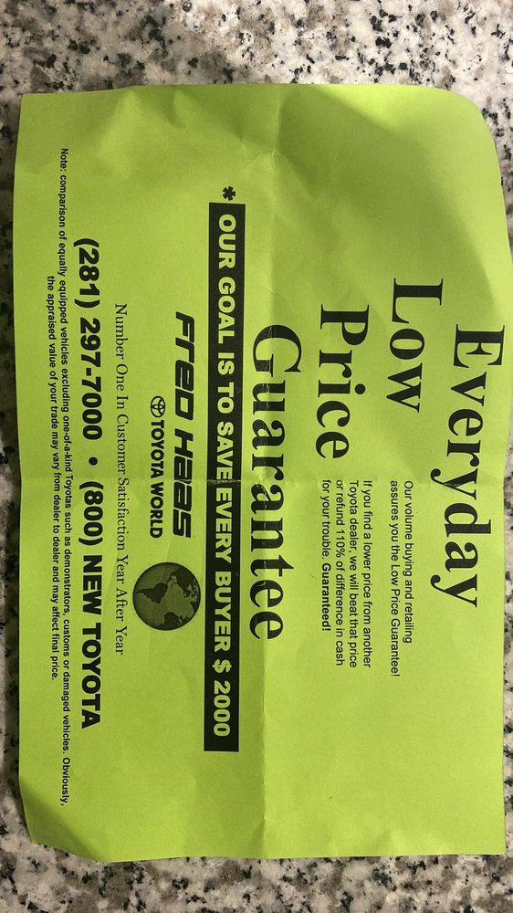 I enjoy making vehicle deals at Fred Haas in Spring, Tx with (Kris Yousefi) the sellsman. This was my 3rd vehicle purchase with him. If you want a new TOYOTA be wise & give the dealership a call, always ask for Kris.!! 🐝 wise. JwS