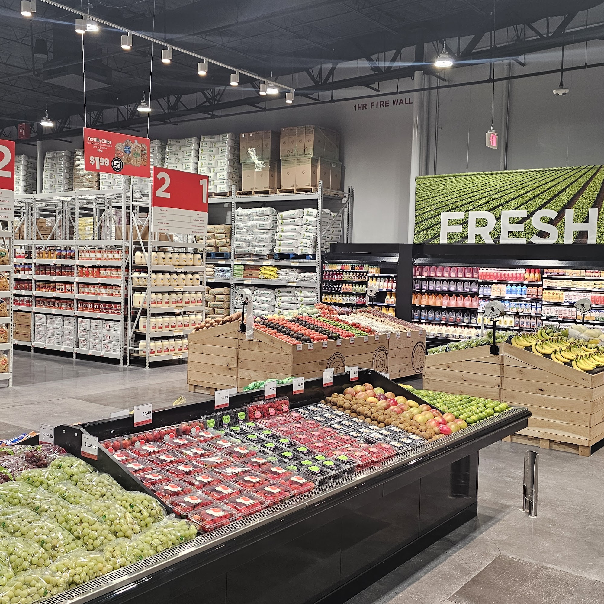 Gordon Restaurant Market is a brand new, extremely clean store that gives a mini Costco vibe. It caters to restaurant owners and those planning large parties or events, but is open to all. The store offers an amazing selection of bulk-sized, restaurant-quality goods. This includes uncooked meat, seafood, precooked food, pork ribs, giant wings, fries, snacks, dairy products, and produce. Unique items like frog legs, fresh bread for po-boys, fresh chips, fresh squeezed juices, Mexican candy, and a giant flavored popcorn station are available. There are also disposable serving utensils and cleaning products for events. The facility features three large walk-in freezer rooms for meat, dairy, and produce, with clearance options in each. Prices offer good deals on some items, saving over regular grocery store prices, though some produce and staples are noted as having high markups. Customers are advised to watch prices at checkout. The store is very impressive, with a pristine environment and attentive staff, making it a great spot to check out for unique bulk items not found at local grocery stores.