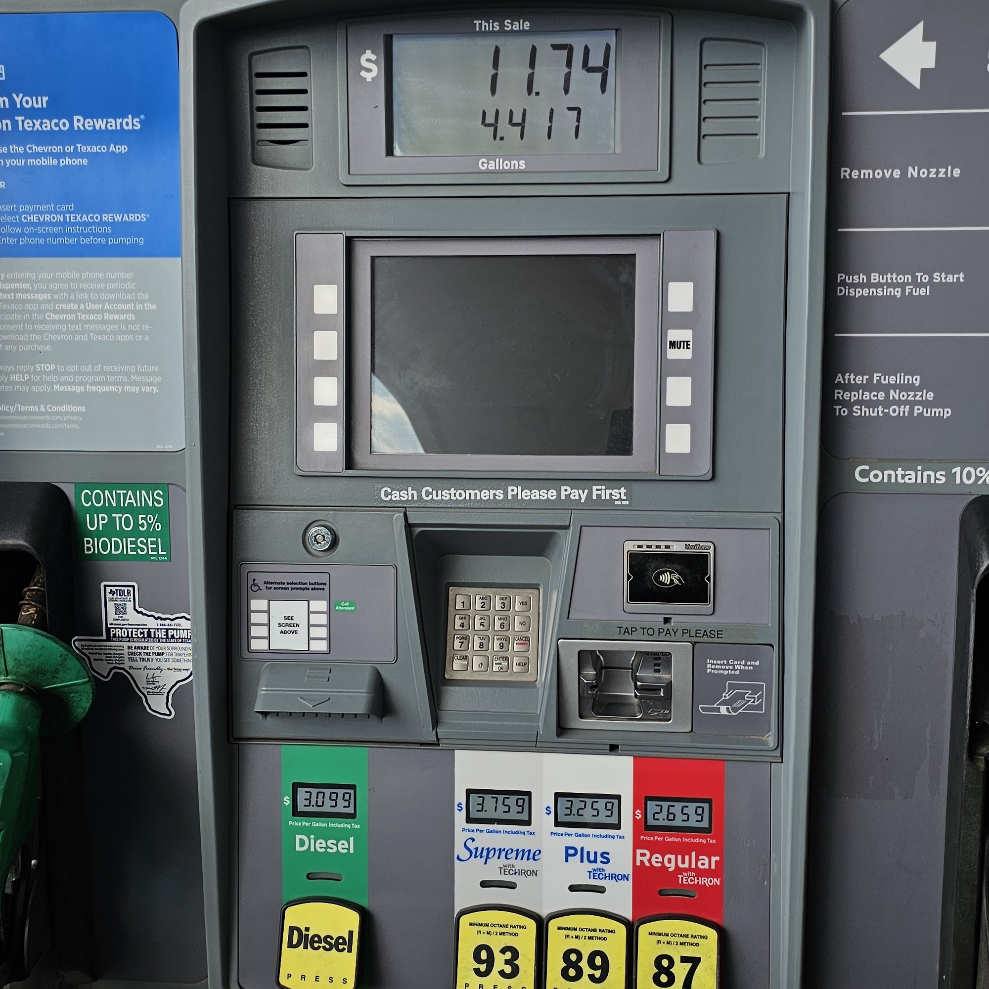 Many of the pumps are usually unusuable and not marked as such nor fixed (frozen screen, missing buttons) they are usually out of receipt paper. My expectations of basic service seem too high for this location. Also, the tap-to-pay never works. Thankfully, the "mute" button does.