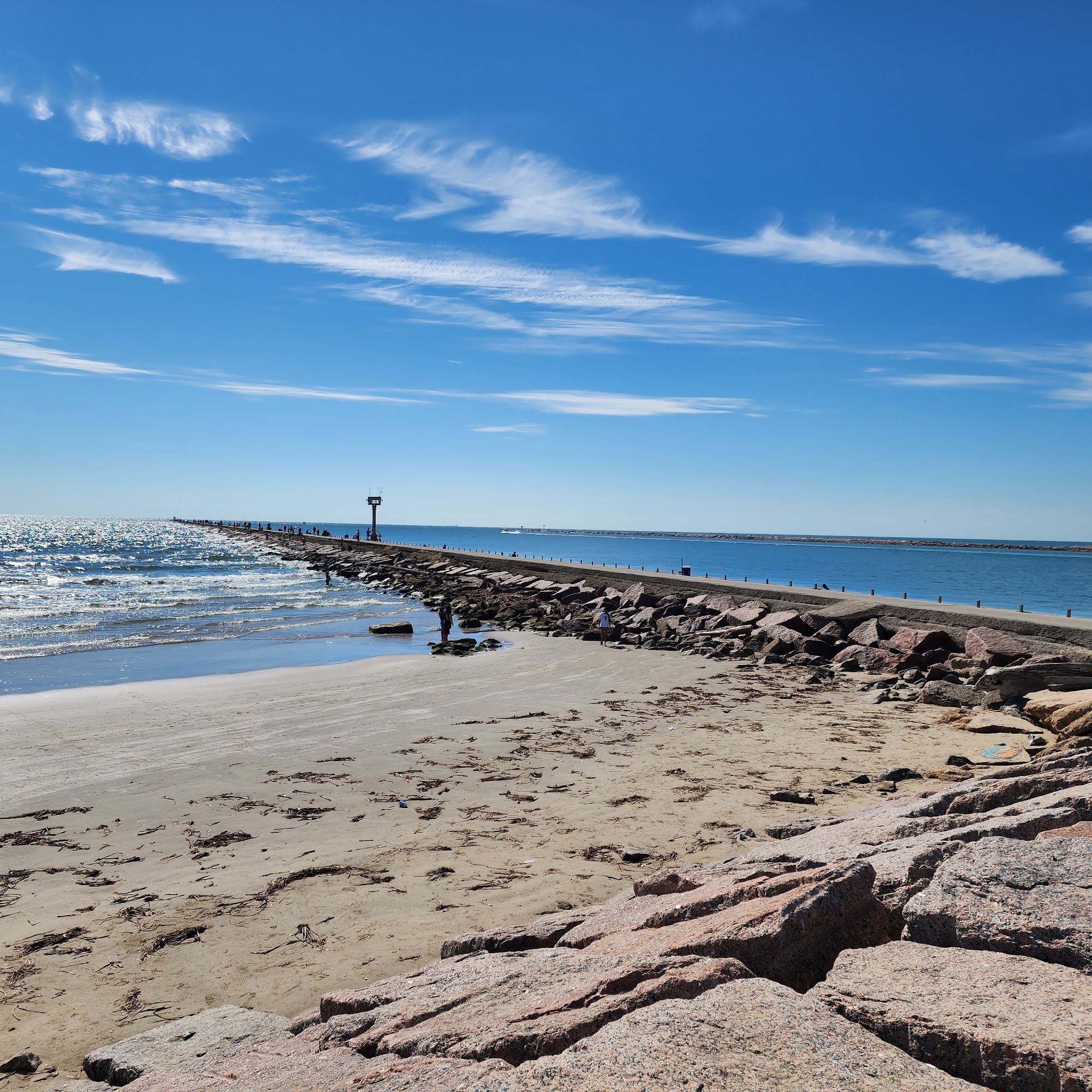 Surfside Jetty County Park is a family-friendly park and beach. It is a great fishing spot along the rocks, where people catch mullet and shark, though it can be pretty crowded with fishers. The beach is clean, good for swimming, surfing, and just hanging out. It is a peaceful and enjoyable area for a walk on the jetty. There are bathrooms on site, but they are reported to be very dirty, smelly, and disgusting. Overall, it is a wonderful place and definitely recommended.