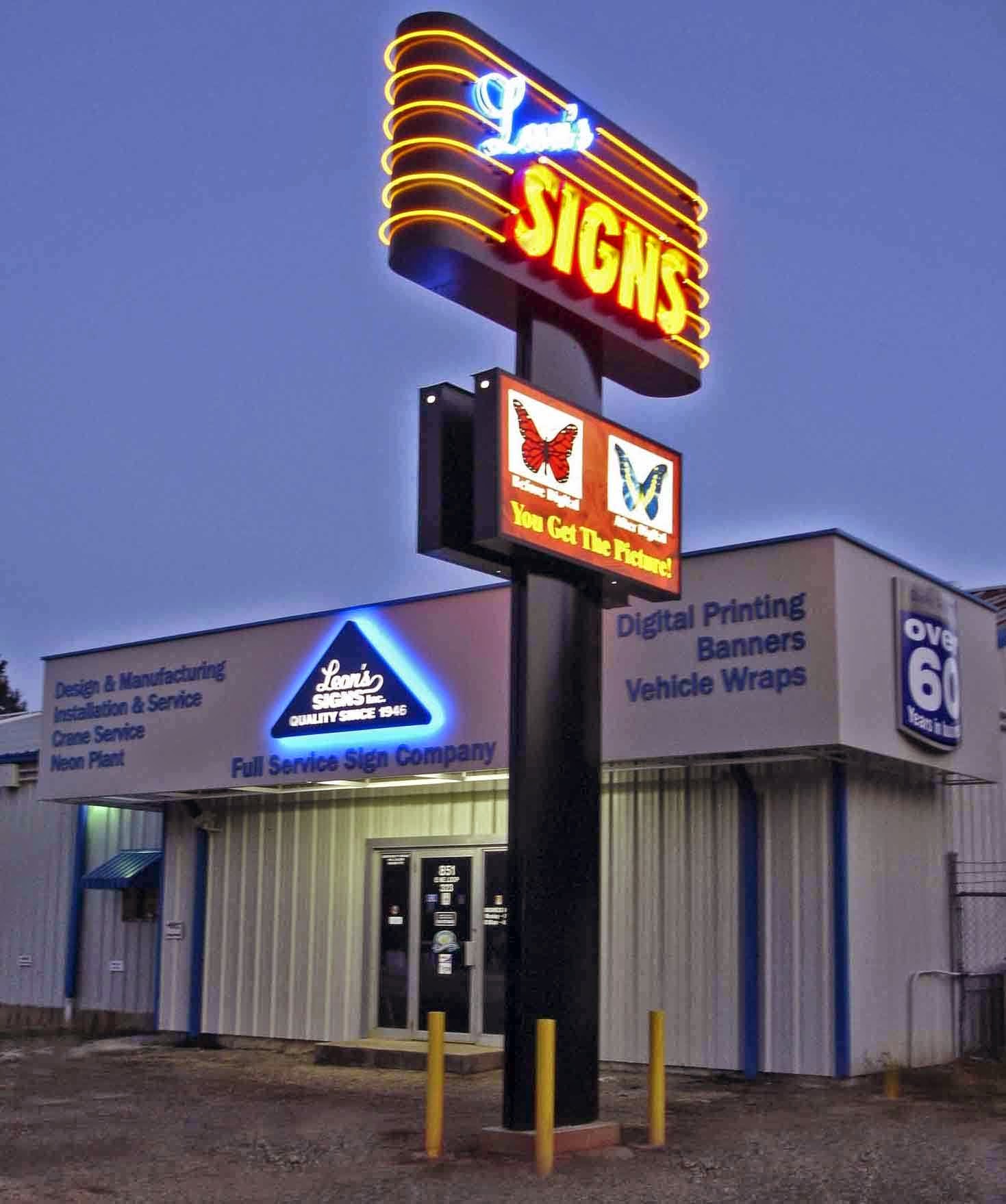 Delivering top quality signs since 1946. For over 75 years, Leon’s Signs has helped all types of businesses get their name before the public in a big, bright way. As a full-service sign manufacturer and installer, we can take your project from inception to implementation.