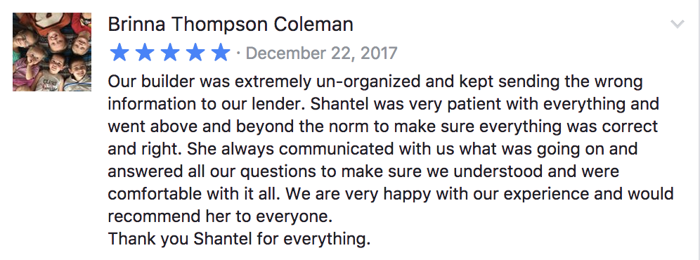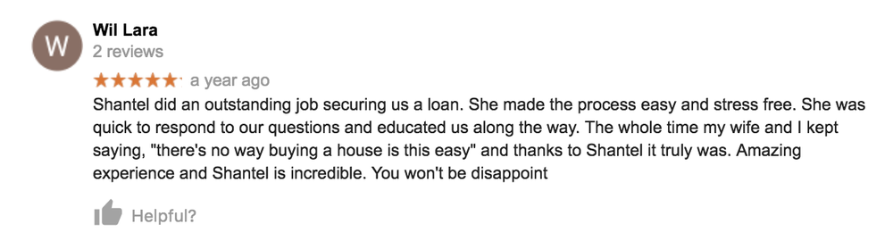 Shantel helped me with the loan on my second home and she was AMAZING!!! It was a complete night and day difference compared to when we bought our first home.