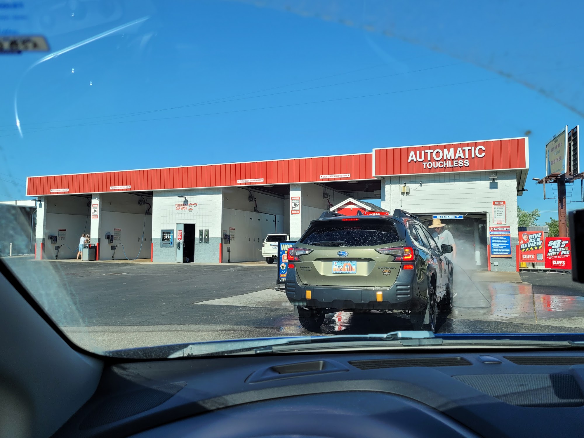Cliff's Carwash is a highly-rated touchless car wash, recognized as the best by Standard Examiner Readers Choice. It offers a convenient monthly unlimited pass for 24-7 access, along with free vacuums and compressed air for thorough cleaning. Attendants are available during business hours to pre-scrub vehicles, ensuring a more effective wash. Customers appreciate the attention to detail, with attendants using power hoses and scrubbers to remove dirt and grime before the automated wash begins. The car wash features four self-serve bays equipped with all necessary cleaning supplies, including air dryers. While the automated credit card machine can be challenging, most customers find great value in the service. The touchless wash utilizes high-pressure jets and quality cleaning solutions, delivering excellent results without damaging the car's finish. Reviewers highlight the friendly staff, especially an employee known for his warm attitude and exceptional service. Overall, Cliff's Carwash is praised for its efficient process, friendly environment, and sparkling clean results, making it a recommended choice for anyone seeking a reliable car wash experience.