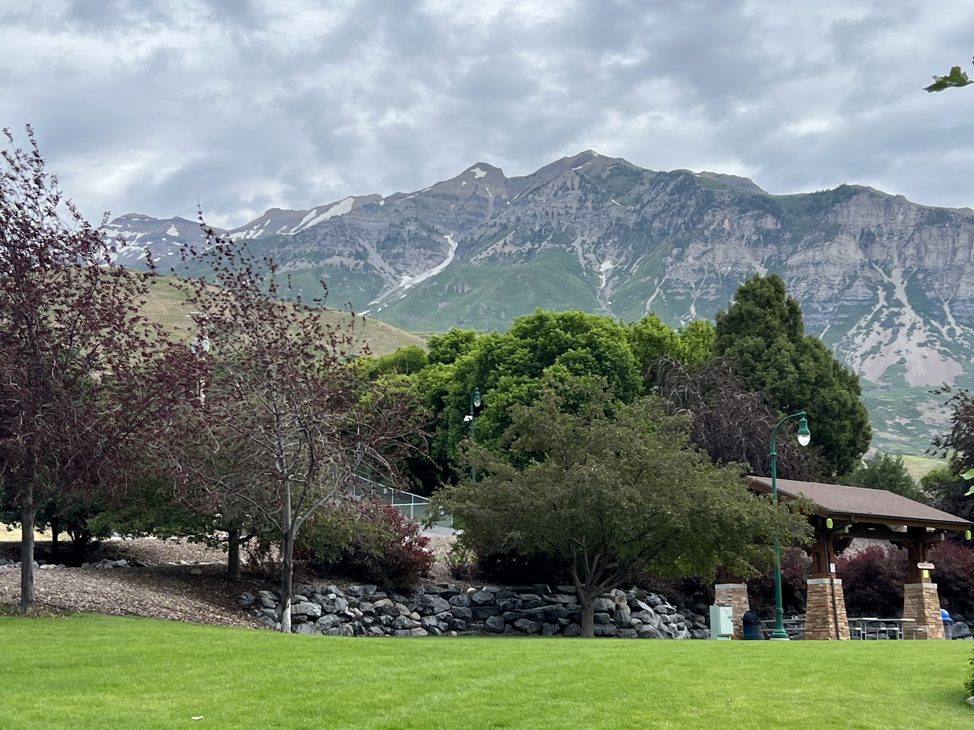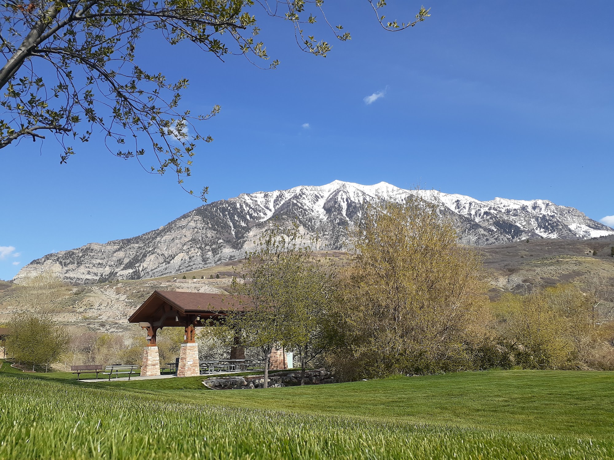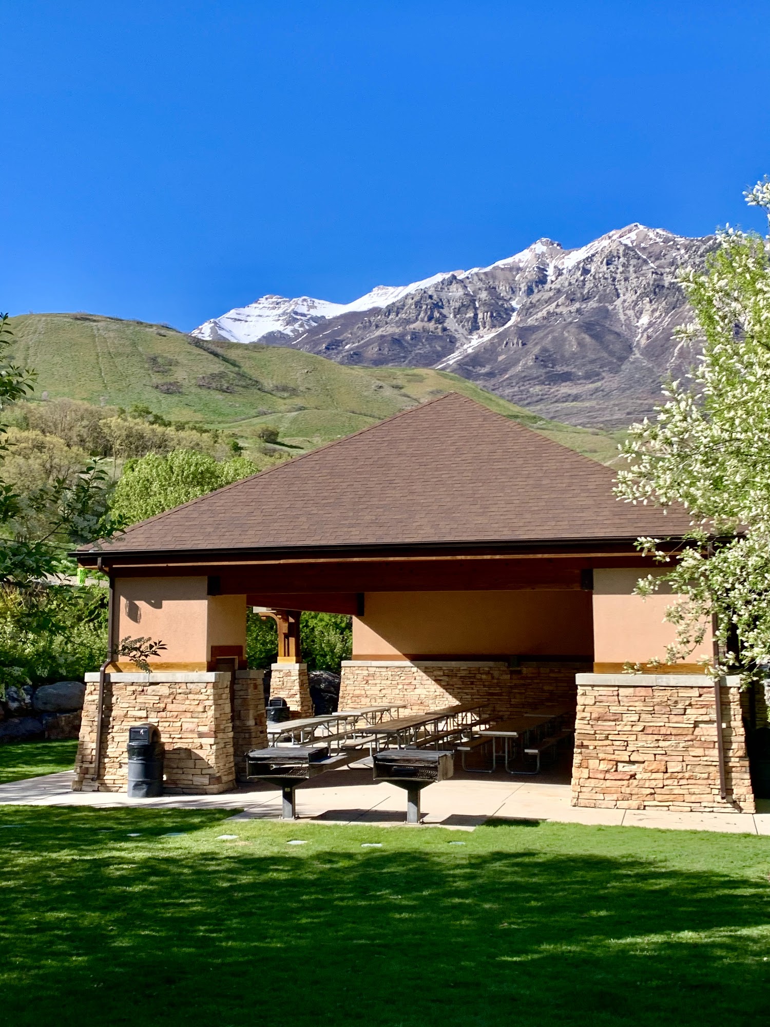 Mount Timpanogos Park is a nice, gorgeous mountain park and a true hidden gem. It is a wonderful area for a picnic, hike, fish, or to just relax near the Provo River. The park offers open space, reservations pavilions, and well-kept bathrooms. It is great for walks, casual visits, and gatherings, with free yoga on Sundays in the summer. While there is no playground and the dog park is rocky and hilly, the overall space is clean, well-maintained, and not overly crowded. It is a cool, relaxing place to be near the water, chill in the trees, or enjoy the spectacular gardens.