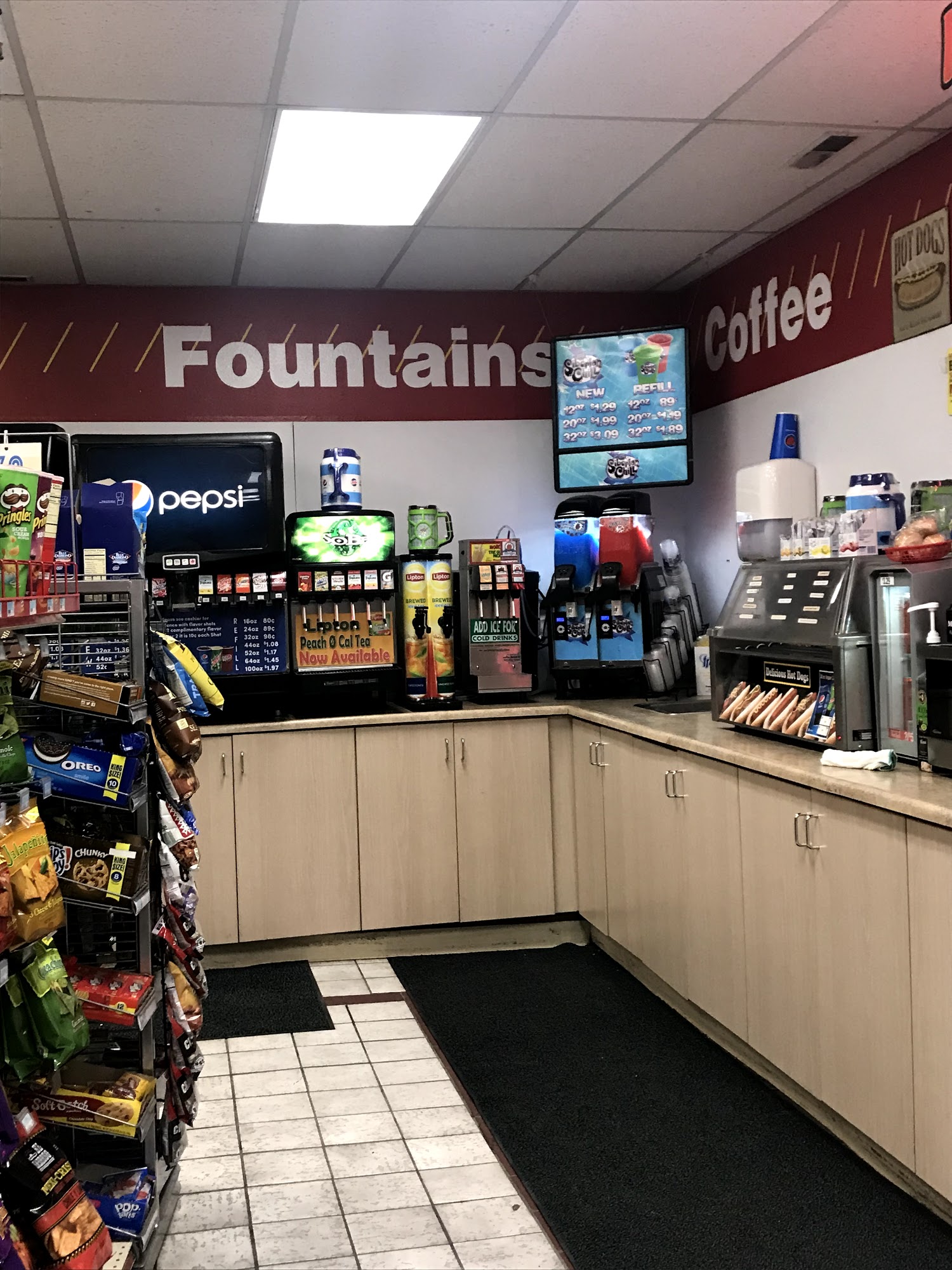 Great place to stop and get gas also a great travel stop hood variety of items drinks and slushy's are served also there is a drive through