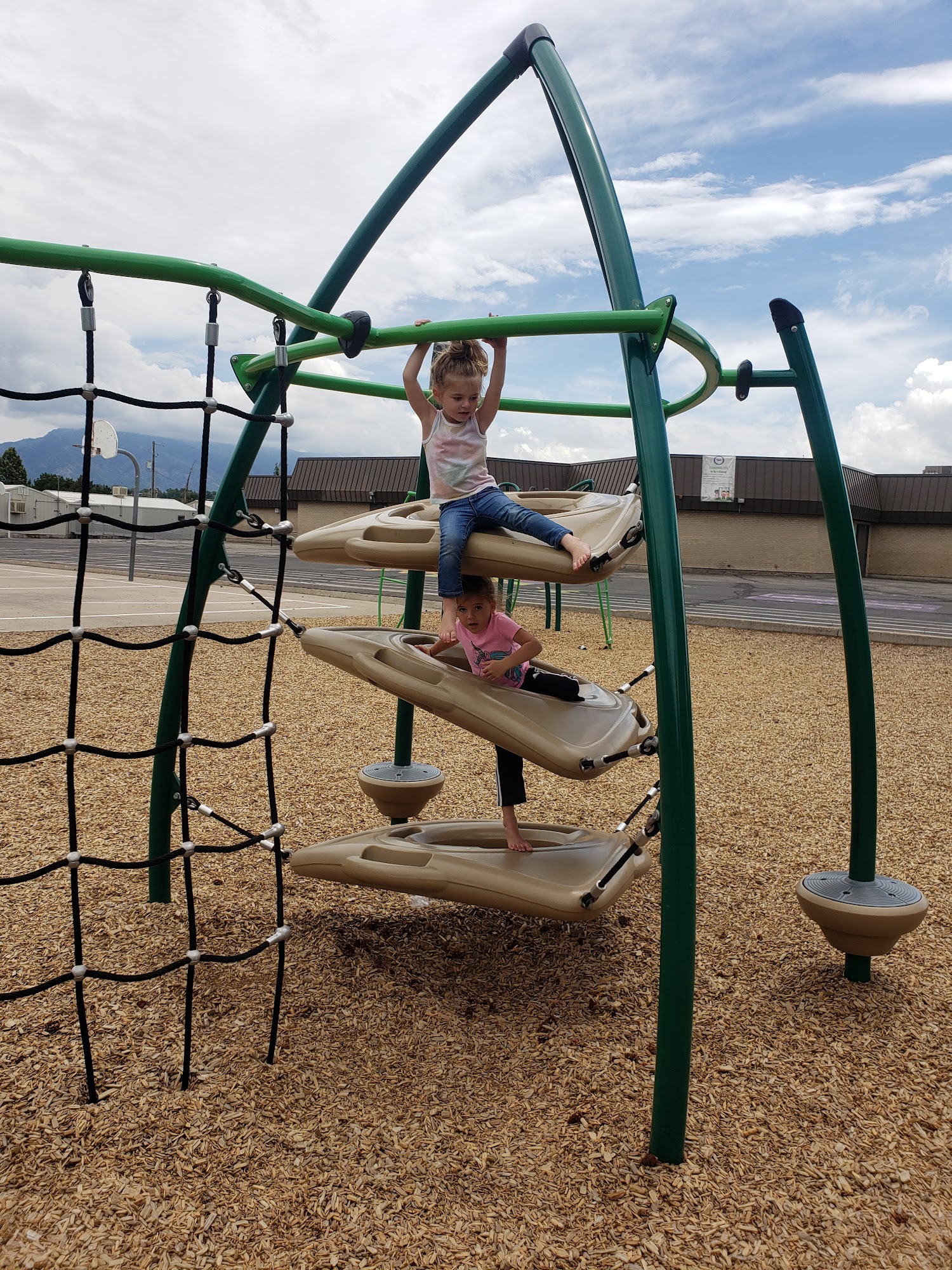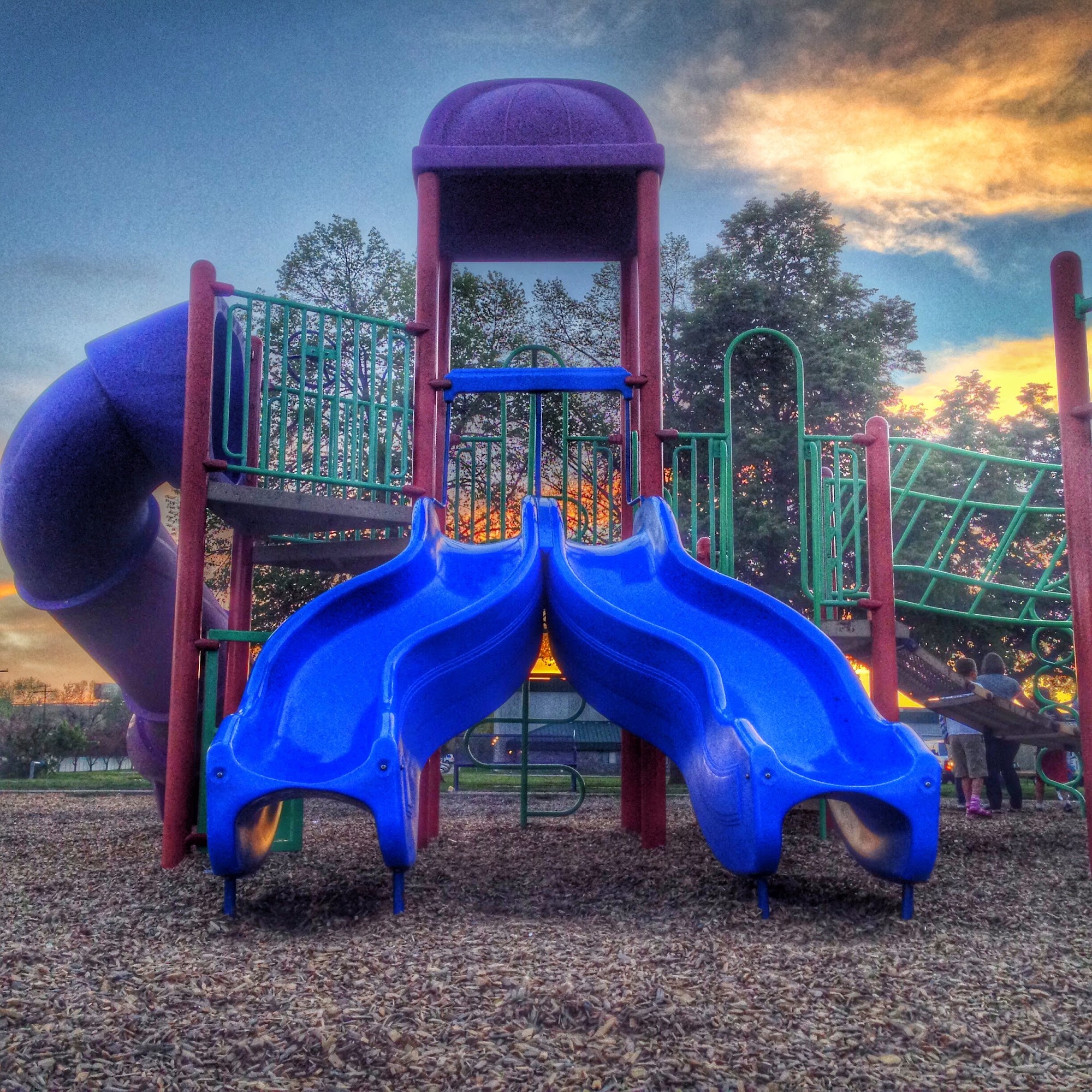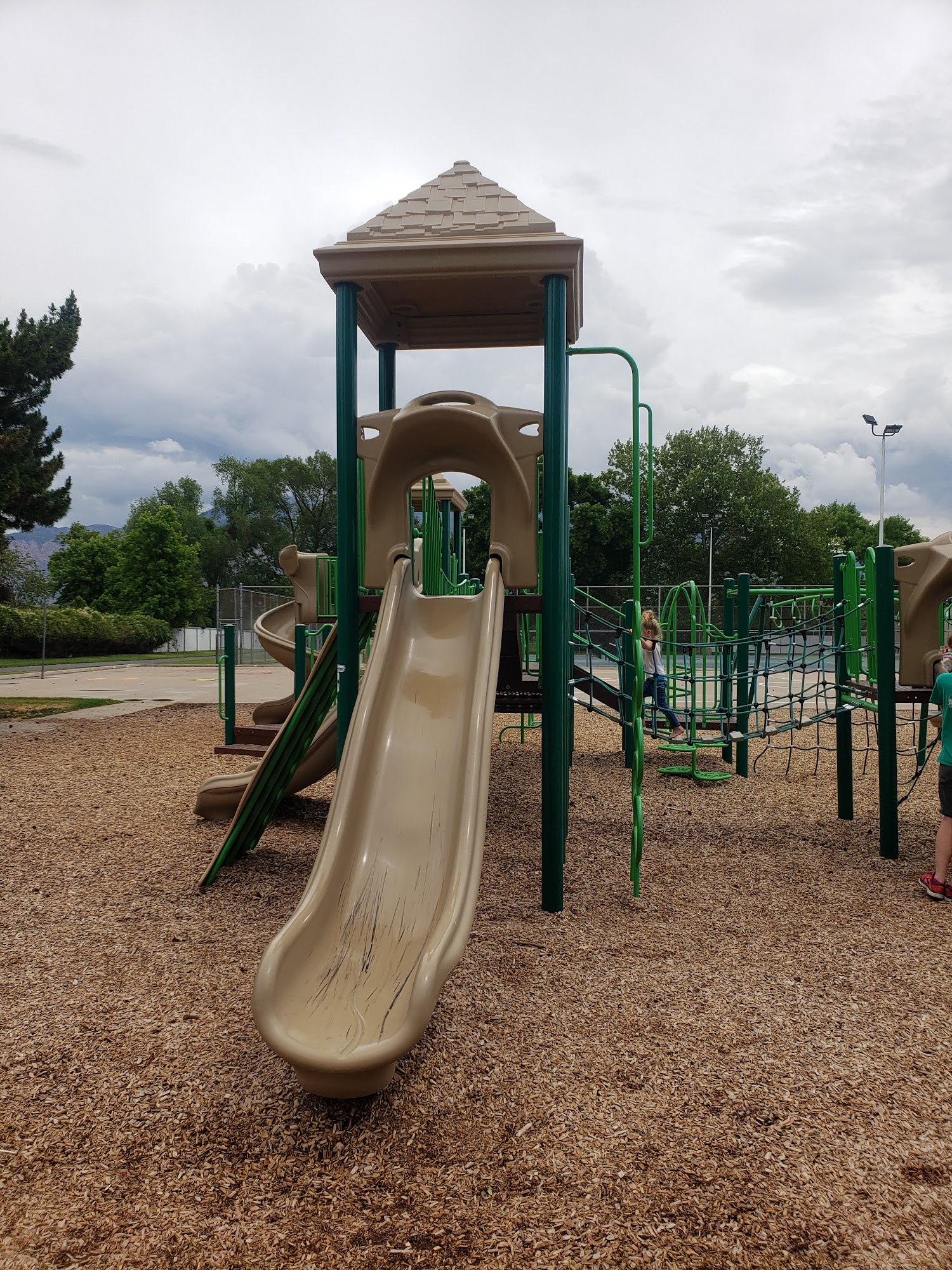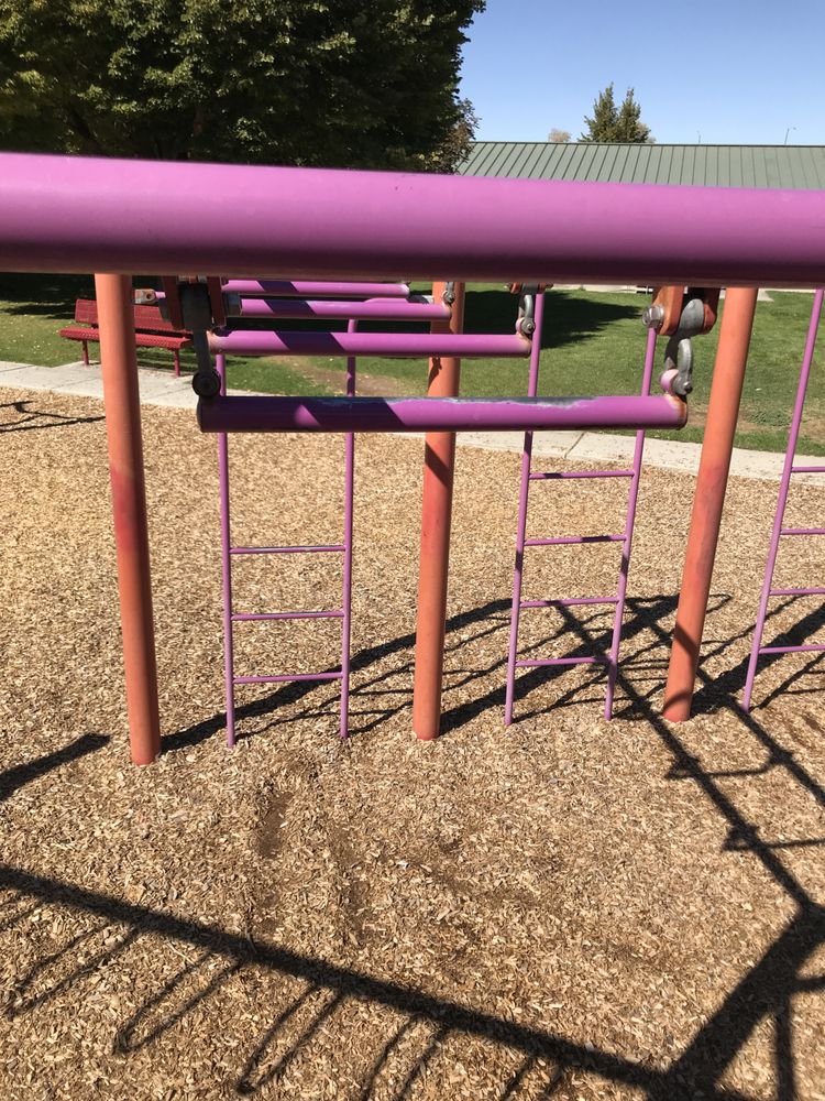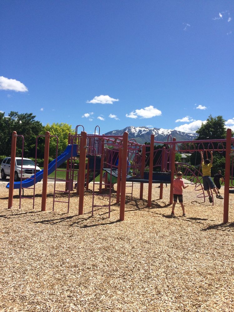 Playground: 2 playgrounds close together a splash pad coal grills available seating volly ball