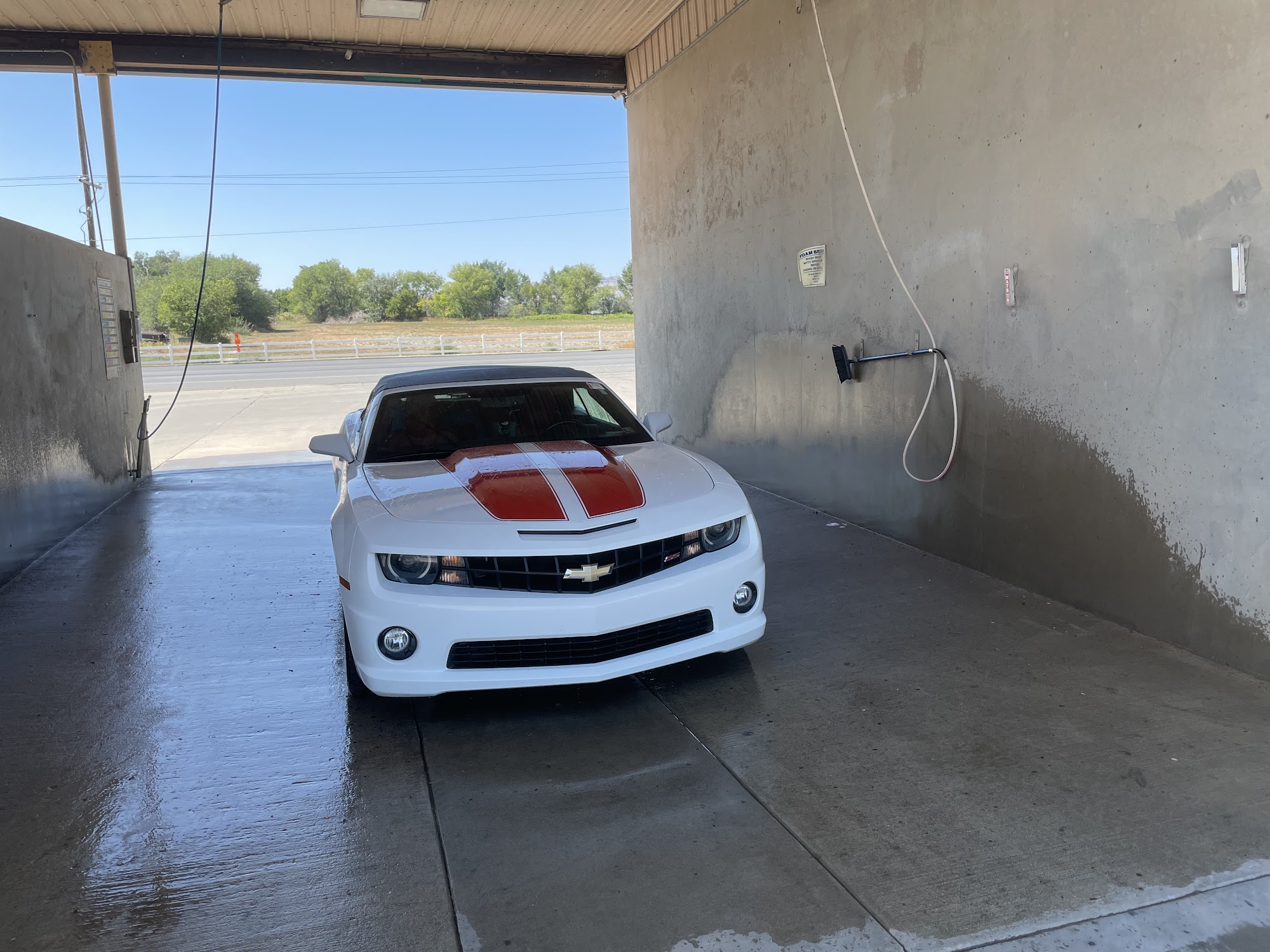 Perfect for big trucks and trailers and RVs. 4 wash slots 13’6” clearance with nice water pressure. There is a big area in lot to move around has garbage bins and vacuums
