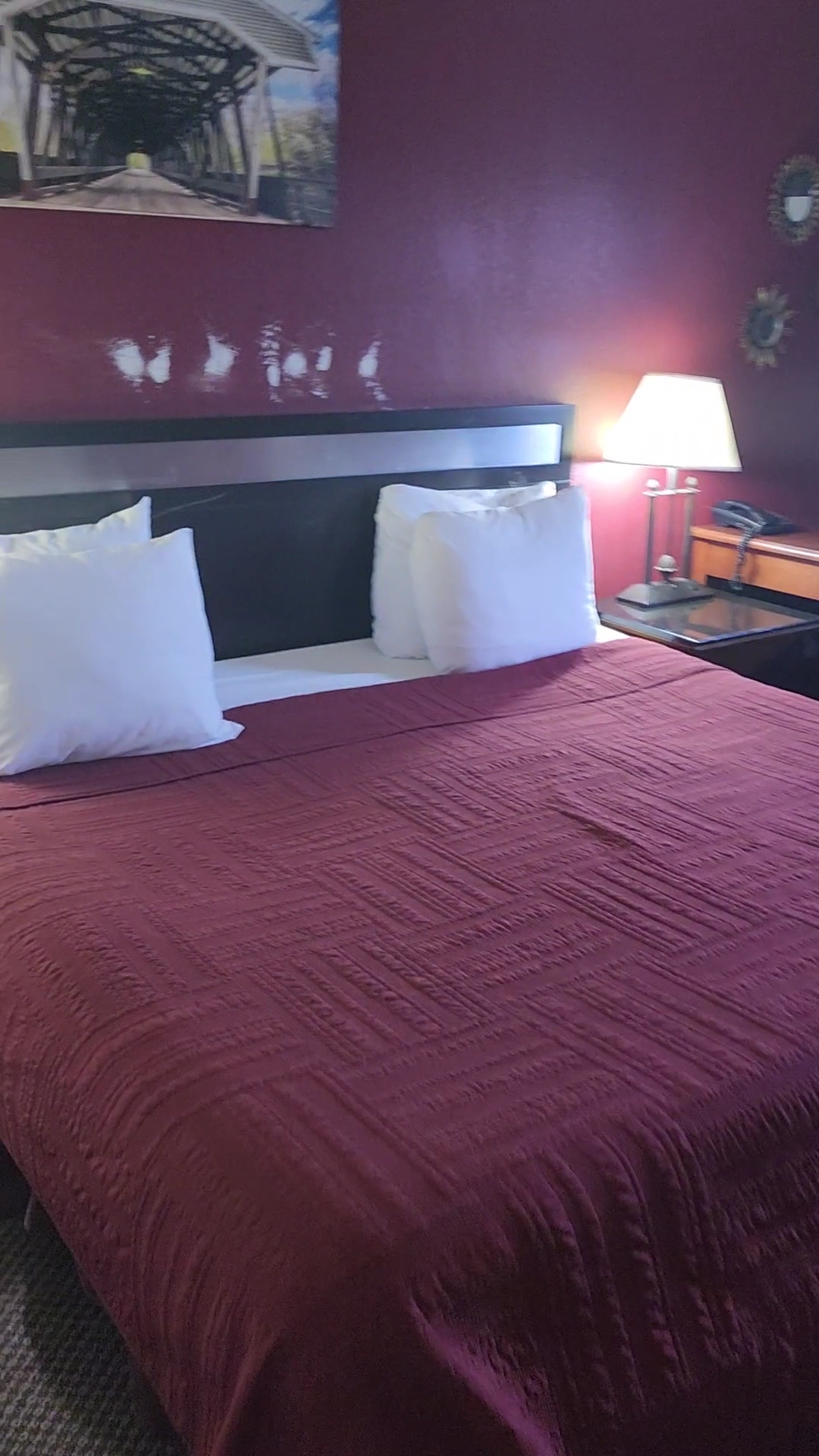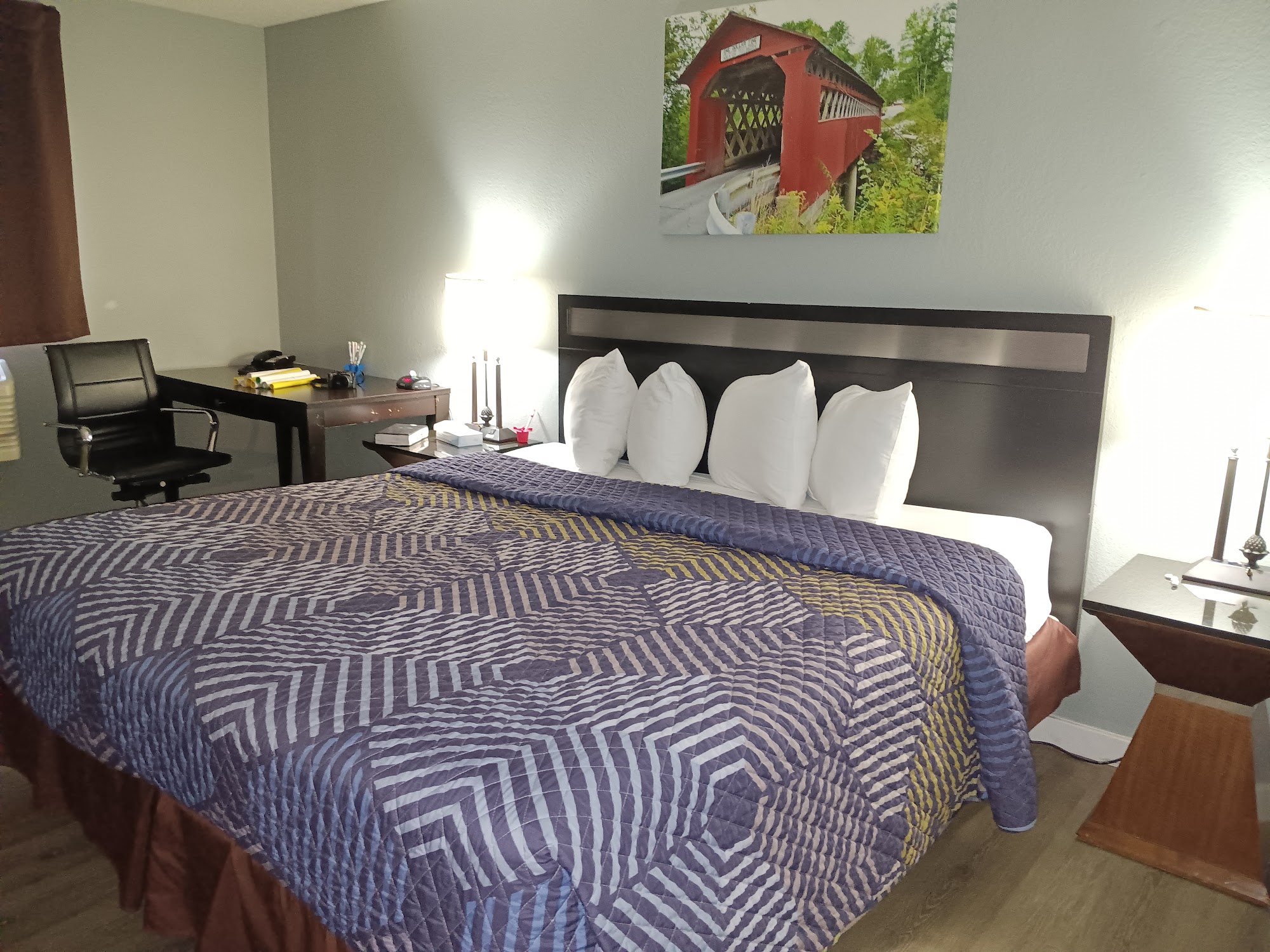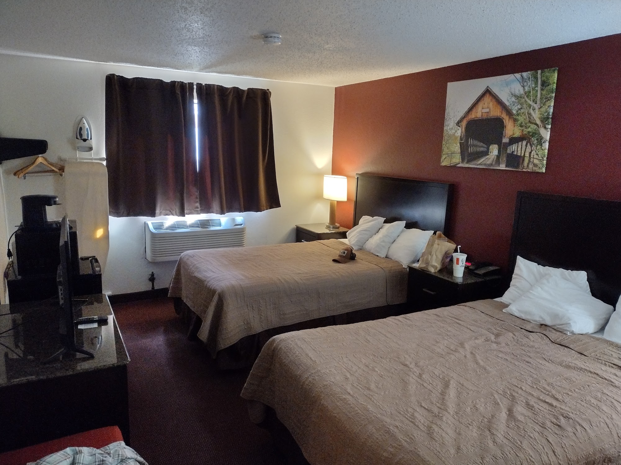 The Covered Bridge Inn is a budget hotel that offers very good value for the money. It is a clean place with comfortable beds and nice bathrooms, and the staff is super nice and helpful. The rooms are kept up and can be quite nice, sometimes featuring very new appliances like a refrigerator and microwave, along with a great TV with cable. The building is flanked by several convenient fast-food restaurants. However, the hotel is a bit rundown and is clearly a work in process. Some rooms, particularly those with carpet, can feel very humid or damp, leading to a damp smell. Despite being smoke-free, some rooms still carry an odor of past smoking, and a thorough cleaning is still required in places. The breakfast is basic, just bagels and cereal, and the small breakfast room can get crowded. The provided toaster is slow and annoying. Parking can be crowded and the back lot is a bit dark. There have been security concerns, such as keycards being left in an unlocked box at a closed front desk, and keycards sometimes failing to work. The lobby is closed late at night, requiring guests to ring a bell for assistance. Noise can be an issue from hallway activity and the outside door banging shut.