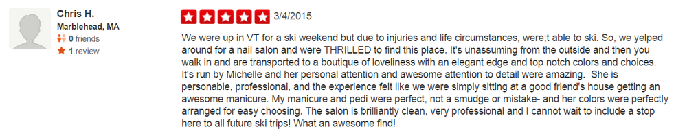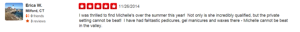 I took my friend here for her first ever pedicure, it was such a great experience! Michele was wonderful!! So easy to talk to :)! Would definitely recommend spending an afternoon at her salon!