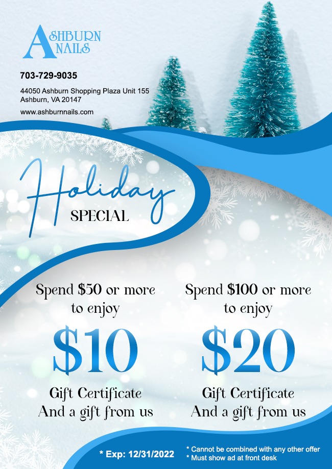Ashburn Spa is located conveniently in Ashburn Village Center. Come to our nail salon to dip into the comfortable atmosphere, airy and elegant space. At Ashburn Spa, we take pride in providing you with all good products and qualified services to help you rejuvenate your beauty. When walking through our door, you will be carefully pampered by our well-trained and enthusiastic staff. Comfort and relaxation are a top priority while you enjoy your service.