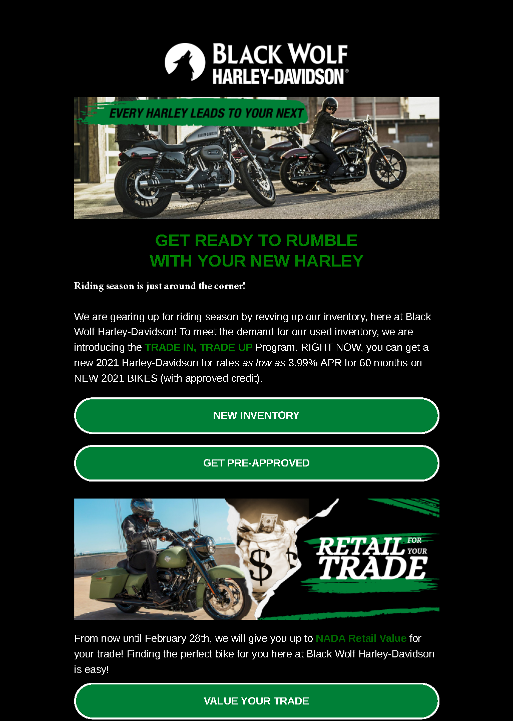 For the Ultimate Harley-Davidson® Experience we invite you to Black Wolf Harley-Davidson®, the largest Harley-Davidson® motorcycle dealership in the Mountain Empire, located just off I-81 [Exit 5] Bristol, VA. We maintain the largest selection of New and Used Harley-Davidson® motorcycles in the area. We offer an array of financing options. Our professional sales staff is ready to make your dreams a reality! We have an extensive selection of MotorClothes®, Parts and Accessories along with highly trained employees, ready to assist you with the proper riding gear, latest styles, and customization of your Harley®. At our state of the art Service Department, our Harley® Certified Technicians have over 40 years of combined experience.