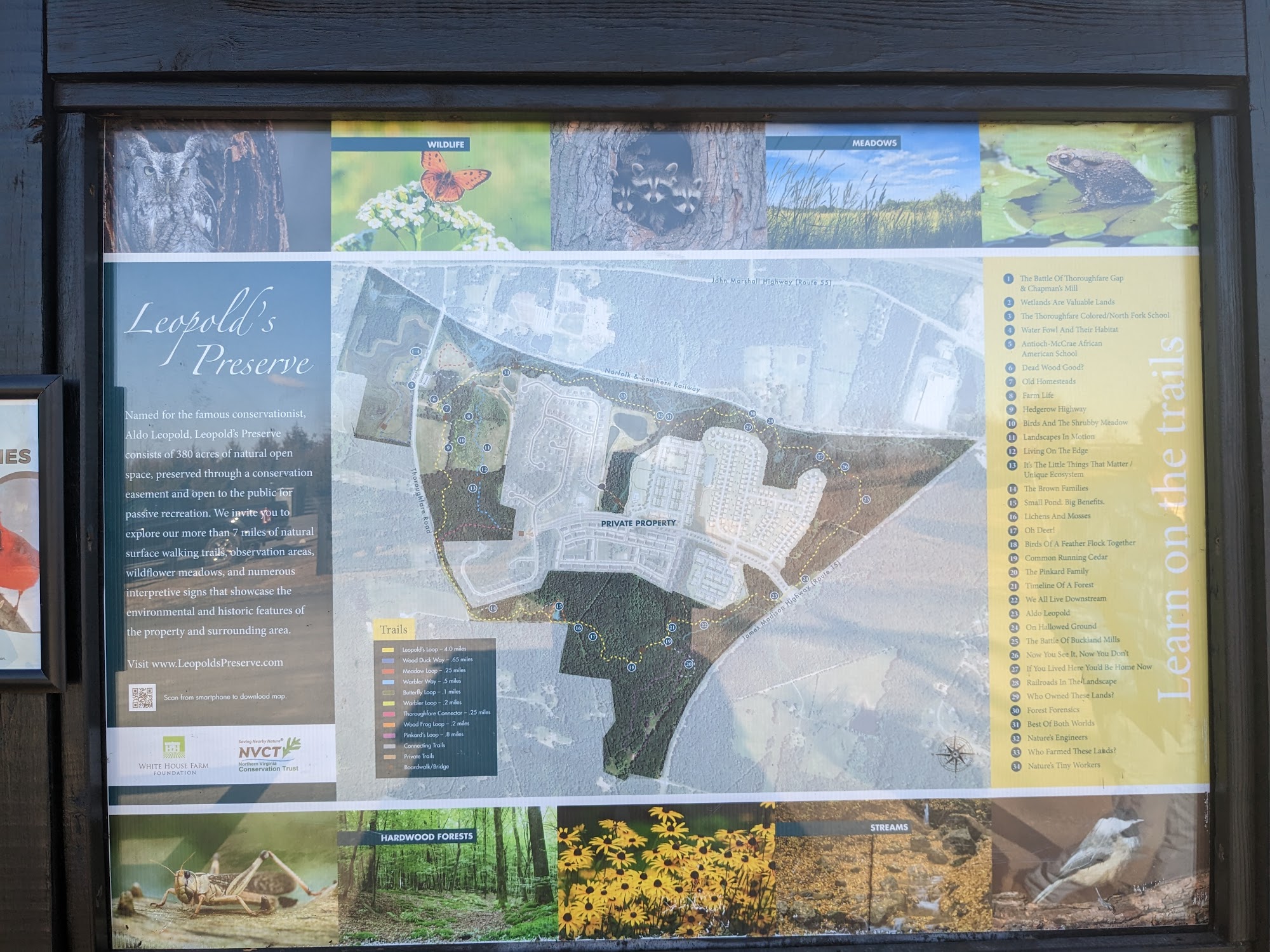 Leopold’s Preserve is a 380-acre park located in Haymarket, VA, about 35 miles west of Washington, DC. It features a 7-mile trail system that allows visitors to explore diverse habitats, scenic overlooks, and historic sites. Free to access and open daily from dawn to dusk, Leopold's Preserve is an ideal spot for hiking, running, birdwatching, and more. Please note that bicycles, motorized vehicles, hunting, and fishing are not allowed. Visit our website to see a full listing of park rules, upcoming events, and points of interest.