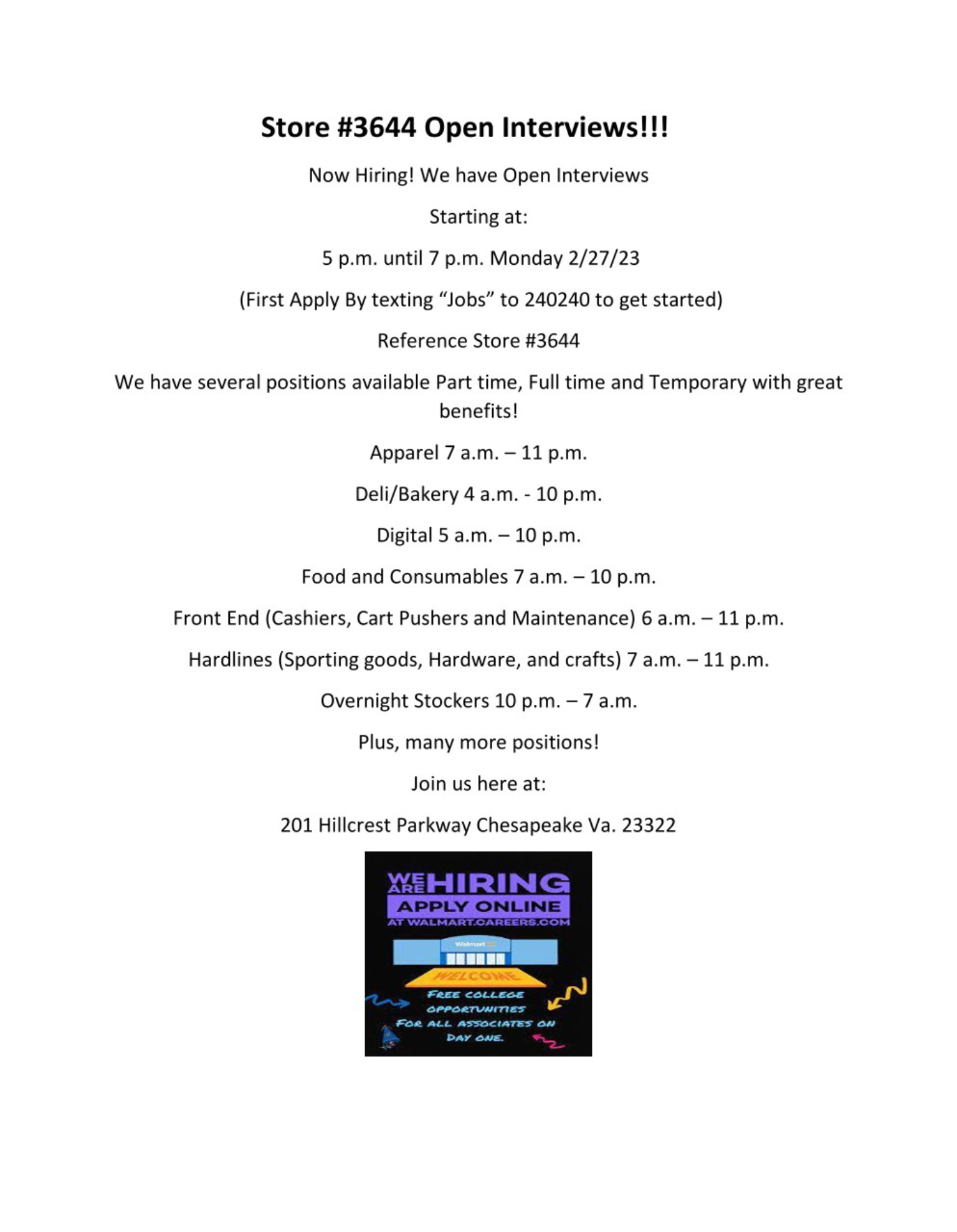 Wal-Mart, 201 Hillcrest Pkwy, Chesapeake VA 23322 Hours