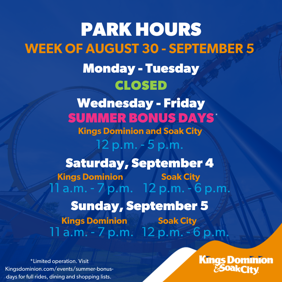 Kings Dominion, a 400-acre amusement park located in Doswell, VA off I-95, is home to more than 60 rides, shows and attractions, including 13 world-class roller coasters and Soak City, a top-rated 20-acre waterpark. Kings Dominion is a property of Cedar Fair Entertainment Company (NYSE: FUN), one of the largest regional amusement-resort operators in the world.