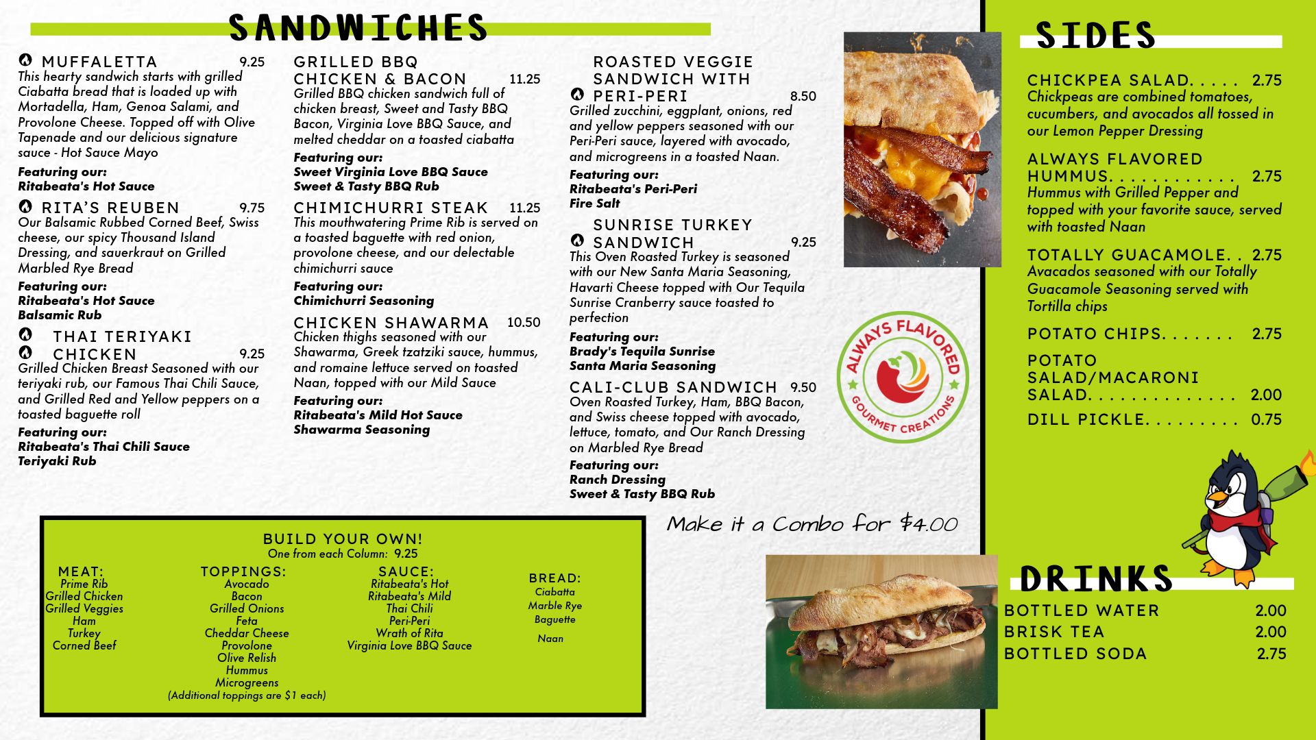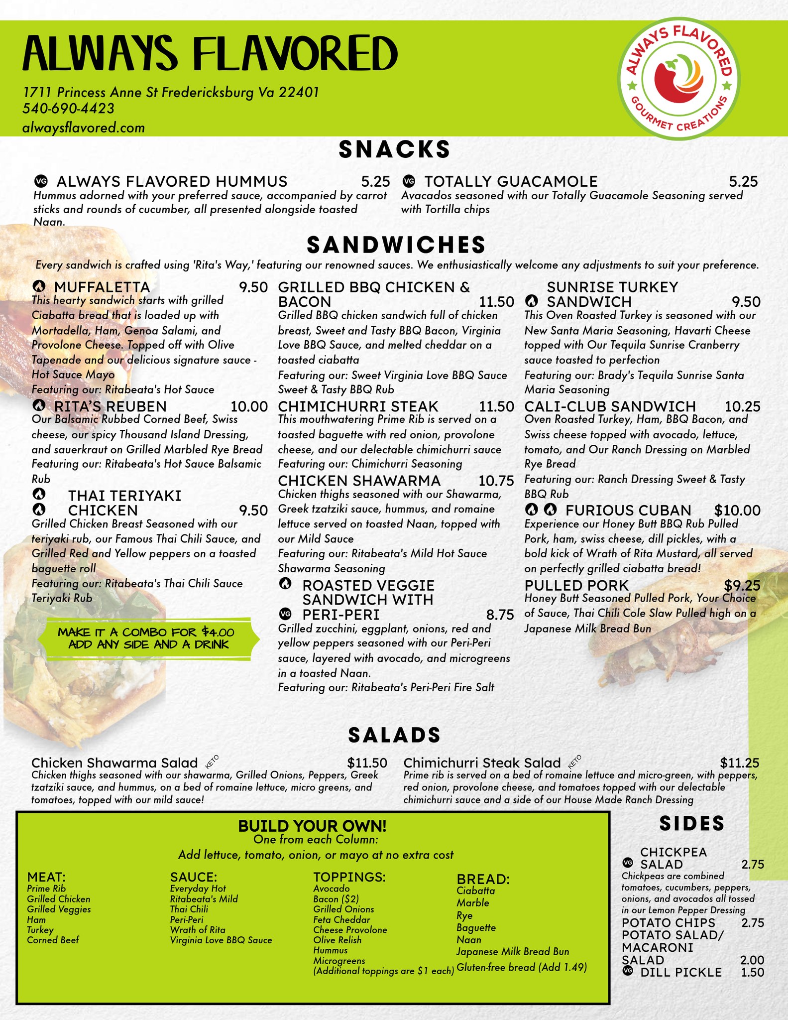 Always Flavored is a local bistro and gourmet sauce shop that opened in 2020. They use their own unique and flavorful sauces and seasonings, which are fermented for optimal taste and nutrition, to make their sandwiches. The sandwiches are made with fresh, locally sourced ingredients and are perfect for busy, health-conscious individuals who crave delicious, nourishing meals. Customers praise the Muffaletta sandwich, Honey Butt Macaroni Salad, and the Grumpy Chicken sandwich as standouts. The shop also offers a build-your-own sandwich option with prime rib and Thai sauce, as well as a chickpea salad. Reviewers highlight the excellent service and the opportunity to sample the hot sauces, describing Always Flavored as a perfect part of the Downtown Fredericksburg community.