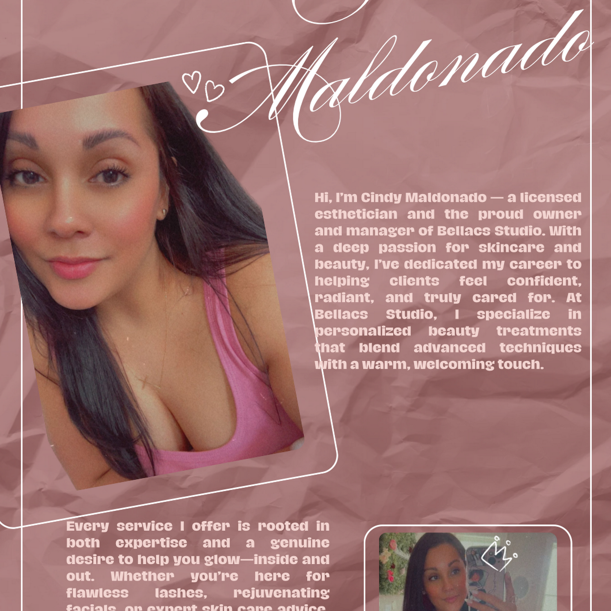 Bellacs Studio, LLC is a beauty establishment founded by licensed esthetician Cindy Maldonado. Cindy is a triple-certified lash artist, makeup artist, and brow technician, dedicated to expanding her knowledge to provide clients with the most effective and up-to-date treatments. Bellacs Studio is an inclusive space where people can reach their skin goals, focusing on their beauty. Clients praise Cindy and her team for their professionalism, expertise, and exceptional service. The studio offers a relaxing atmosphere, fair rates, and a range of services, including lash extensions, brow shaping, and more. Customers highly recommend Bellacs Studio for its quality treatments and welcoming environment.