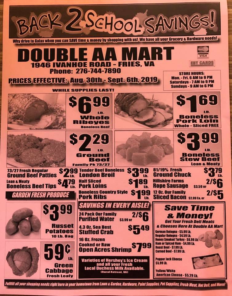 Double AA Mart LLC is a great little store in Fries, VA, described as amazing and the best around. It is a little gem with a little bit of everything you could ever need for daily use. The store offers fruits, vegetables, dairy products, fresh produce, and fresh meats with excellent quality and great prices. It also provides gas, diesel, hardware, beer, and even fishing bait. The people who work there are really kind, friendly, and happy to help, with an actual cashier. While some miss previous offerings like pizza, the store's useful variety earns it high praise.