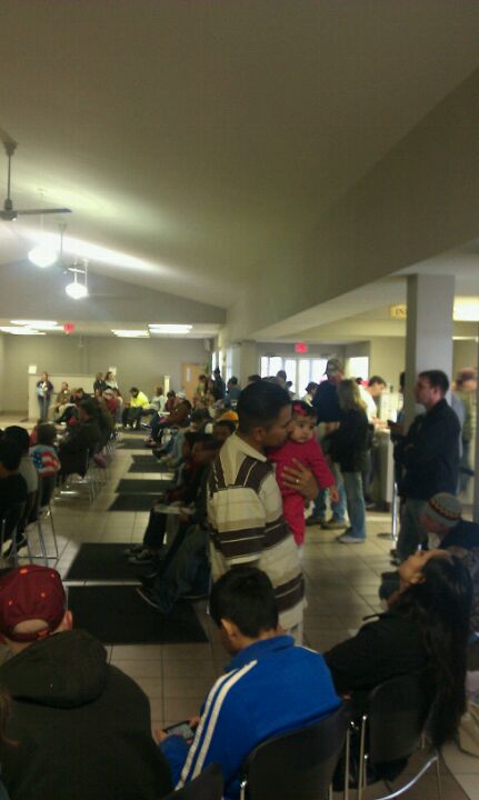 The DMV. Last Saturday of the month. The line was out the door when we arrived. It took us less than an hour total.