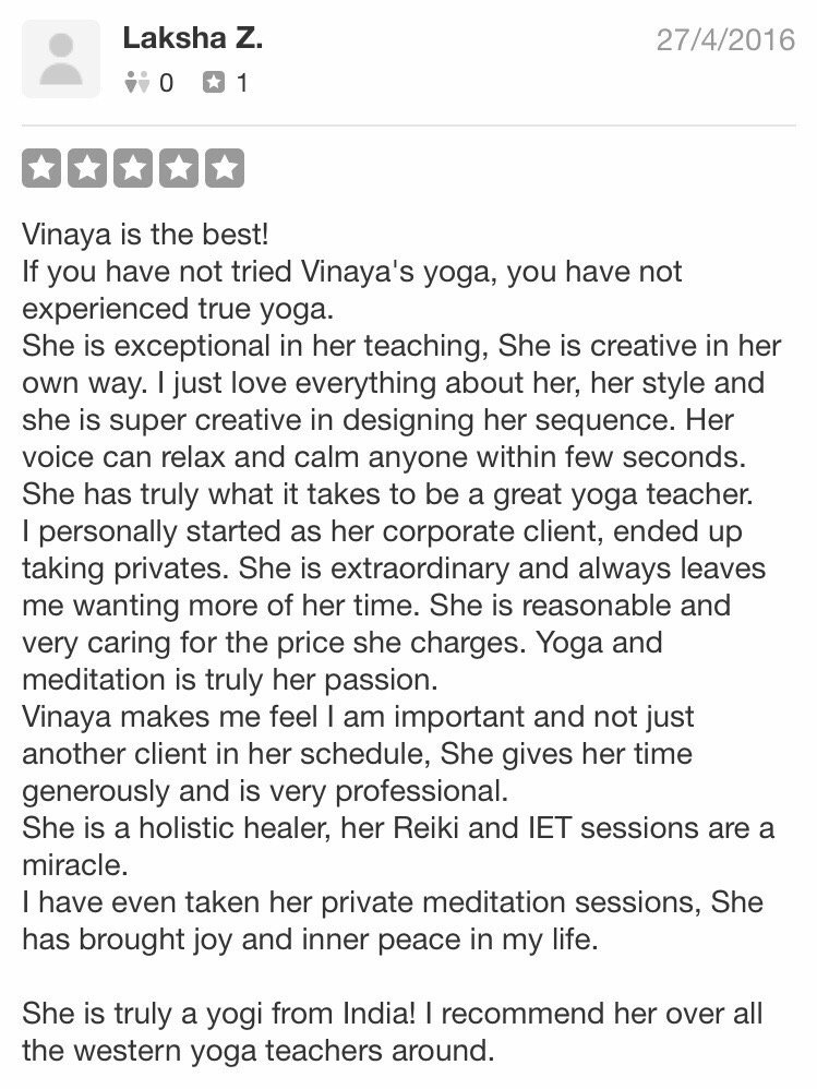 Vinaya teaches personalized yoga (vinayam), aimed at helping achieve personal goals. I had severe spondylitis and cramps. Vinaya has helped me cure then completely, taught best yoga practices and life principles. She is a rare and authentic trainer who can solve any problems with yoga and ayurveda.