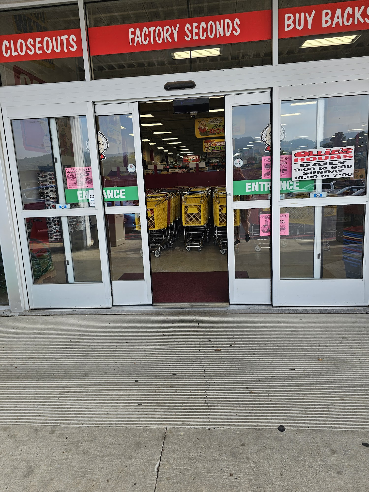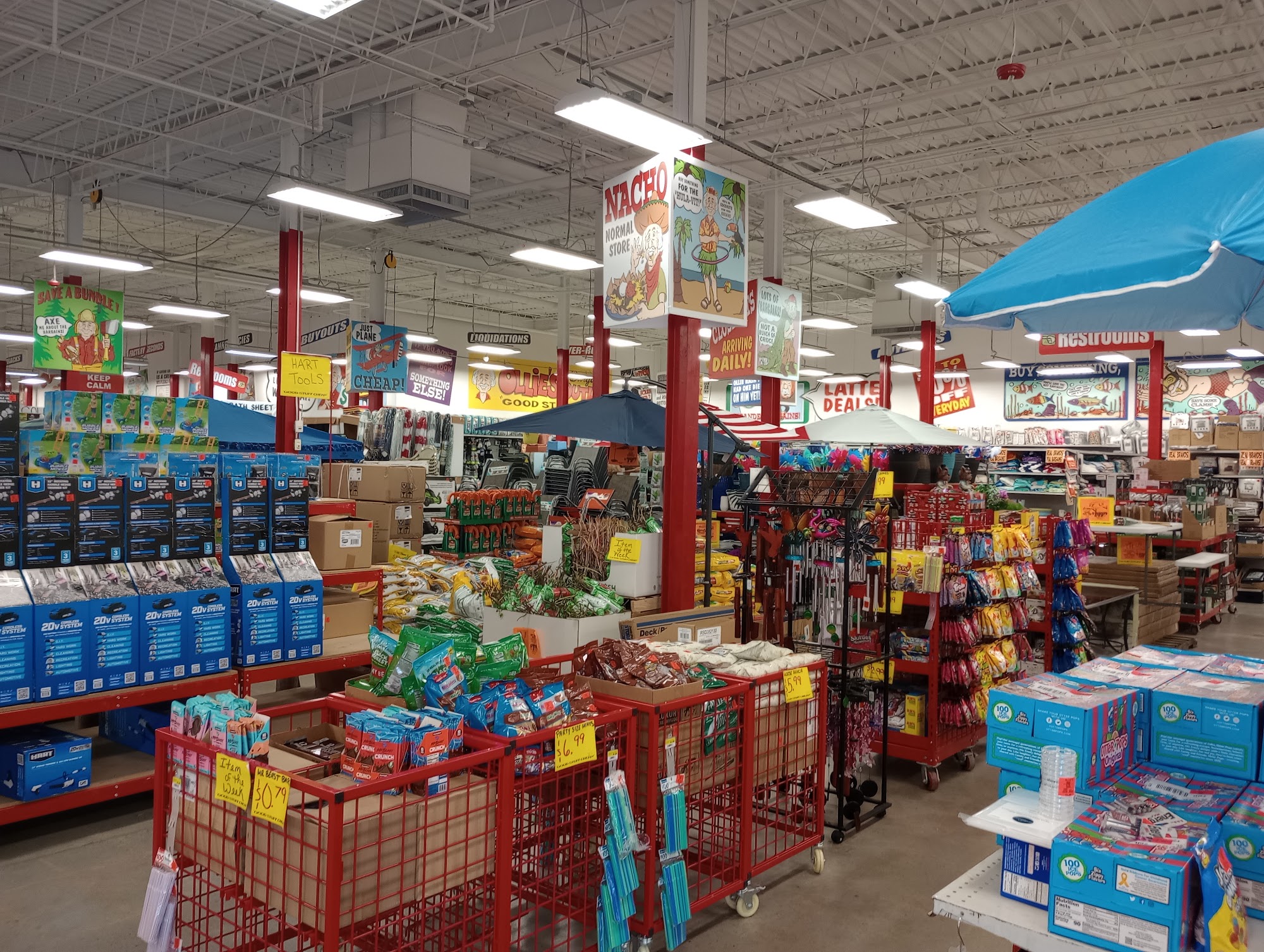 Ollie's Bargain Outlet offers discounted coffee, candy, antioxidant mix (the best), reading glasses, and more. Staff are friendly, helpful, and super nice. The discounted section is funny, but deals are amazing and unbelievable, especially on curtains and dig snacks. The store is large, the size of a grocery store, and most comprehensive, with extensive wares. Customers often drive an hour to visit and find everything they need or want. It runs hot, so bring a wearable fan, even in fall or winter. Employees watch customers closely but remain kind and sweet. Ollie's is a valuable resource in this rural community.