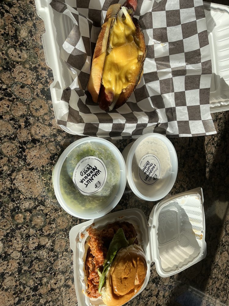 Order to go their: cheese burger, fried chicken sandwich, grilled cheese, and a side of curry chicken salad. Thick, hearty, delicious!