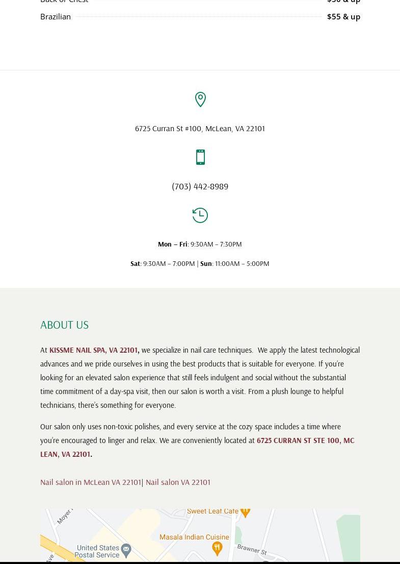 Kissme Nail Spa For Your Youthful Look & Beautiful Nails! At KISSME NAIL SPA, VA 22101, we specialize in nail care techniques. We apply the latest technological advances and we pride ourselves in using the best products that is suitable for everyone. If you’re looking for an elevated salon experience that still feels indulgent and social without the substantial time commitment of a day-spa visit, then our salon is worth a visit. From a plush lounge to helpful technicians, there’s something for everyone. Our salon only uses non-toxic polishes, and every service at the cozy space includes a time where you’re encouraged to linger and relax. We are conveniently located at 6725 CURRAN ST STE 100, MC LEAN, VA 22101.