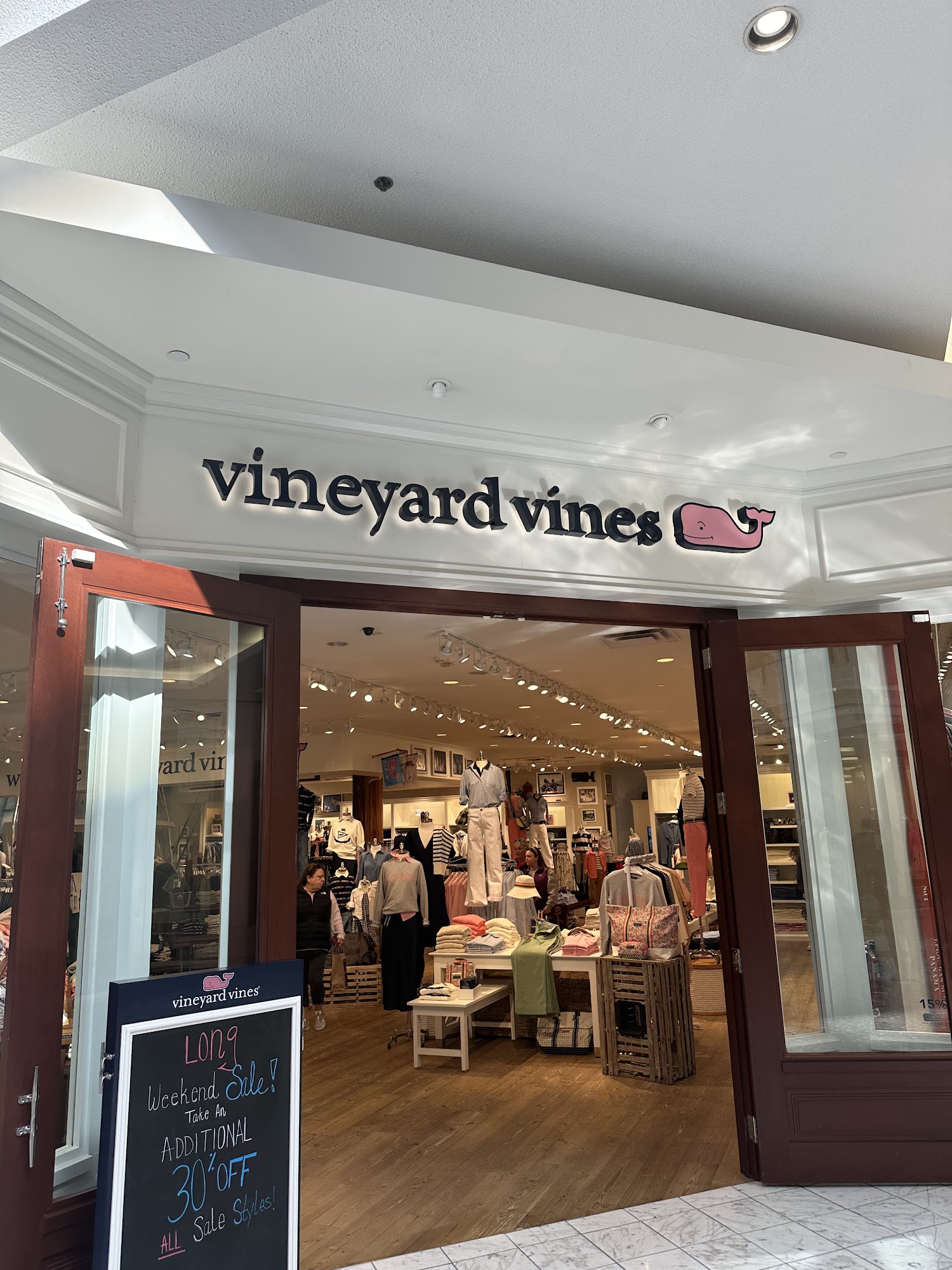 The Vineyard Vines store at the Galleria Tysons in McLean, VA features a vibrant and colorful selection of men’s, women’s and youth clothing. The store had a great selection of navy and grey pieces that flowed well with business casual trims. The staff is friendly, busy, and helpful!