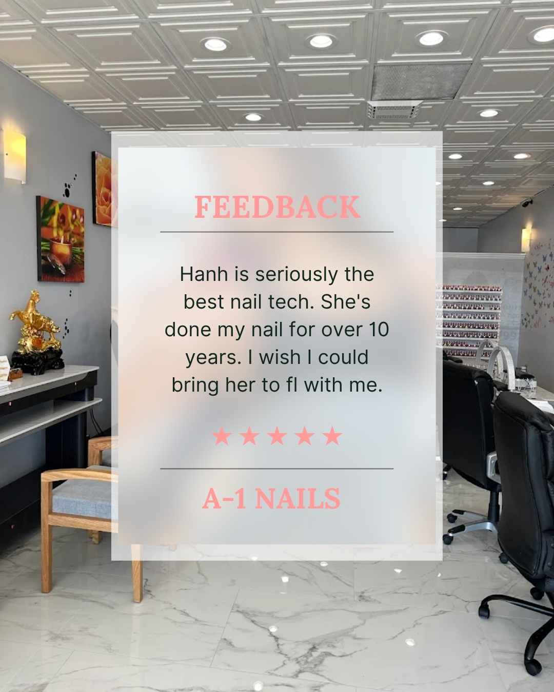 Hanh does a fantastic job on my nails! She takes her time and never rushes through the process. She's done my nails for 8 months and I'll never go anywhere else.