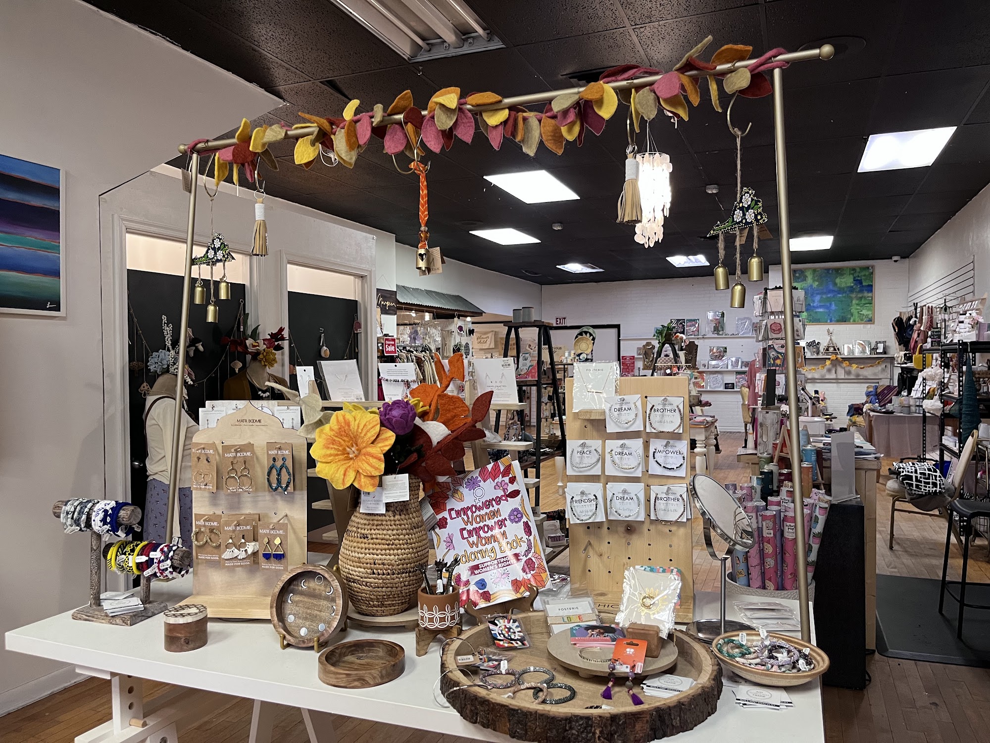 Maison Soleil is a lovely, cozy, and inviting shop. It is a unique fair-trade boutique focused on empowering women and offering local, eco-conscious options. The collection features a wide variety of thoughtfully picked products, including cute clothes, handmade jewelry, vintage items, and gotta-haves. The layout makes sense and is not cluttered. The space feels special and intentional, making it a place to shop for a best friend, girlfriend, sister, or yourself. The personable and kind staff treat everyone like a friend, creating a great shopping experience. Customers love coming here and often find they never leave without buying something.