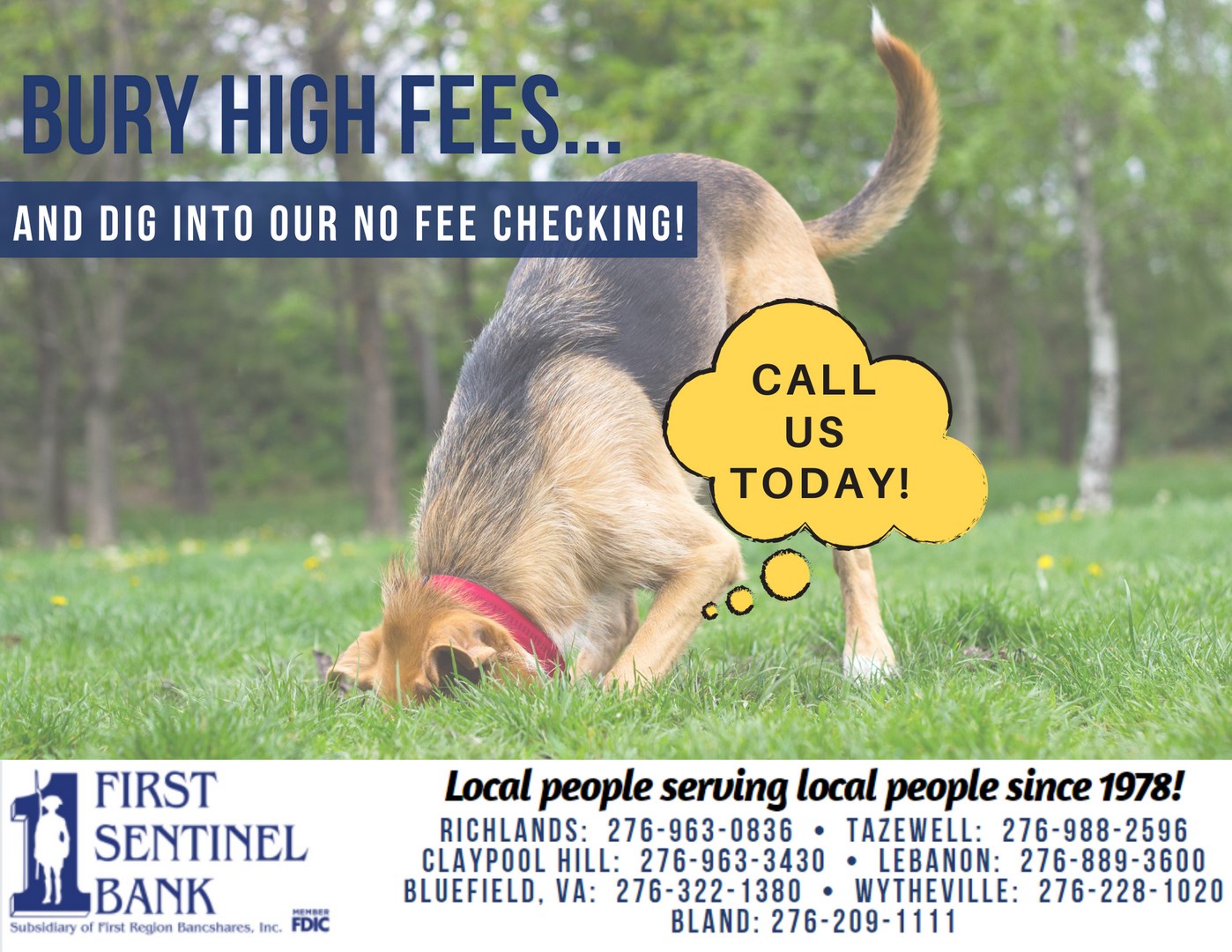 I personally would recommend first sentinel! I have banked there since 1992 and they have been wonderful to me. They have helped me through a fraud and returned my money promptly!