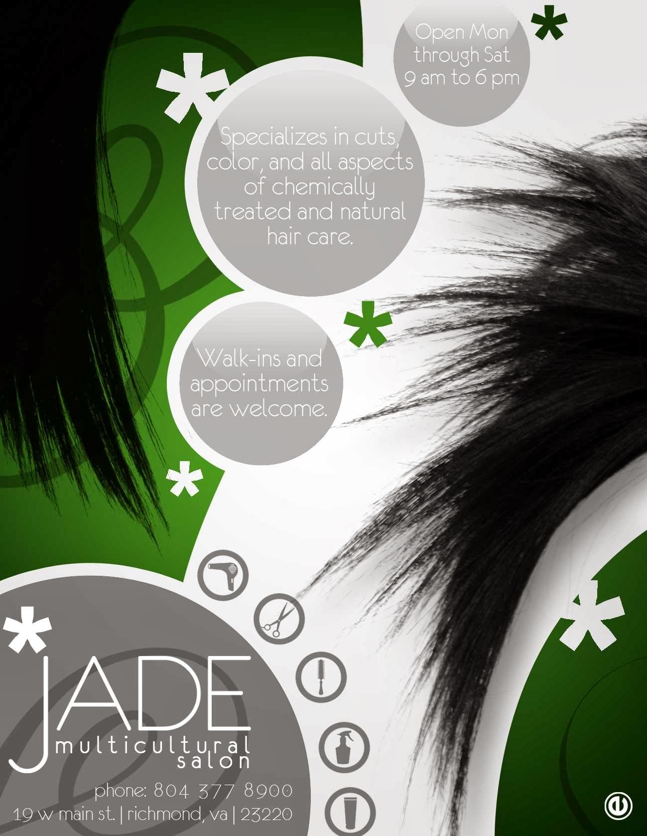 Welcome to The Jade Salon a multicultural full service hair care salon. We specialize in custom color, precision cuts, and natural styles as well as all aspects of hair care for men, women and children. With over 20 years of progressive experience in the hair care industry, our goal is to enhance our clients overall image and provide cutting edge hair care education. Our main focus is to develop long-term solutions for improving the health and quality of their hair so that a happy client is an informed client.