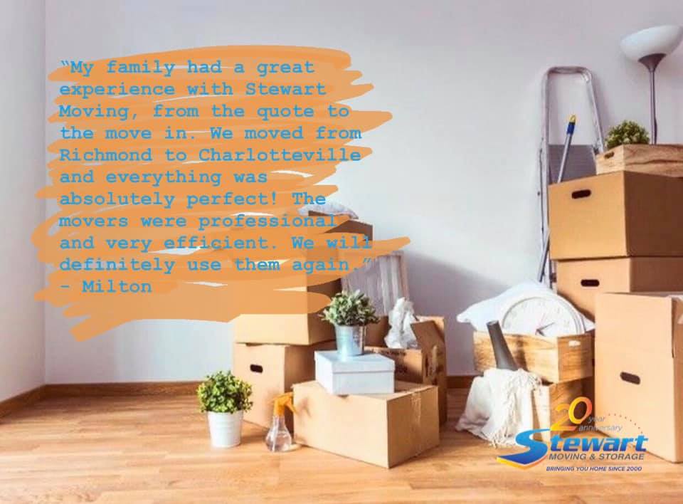 Stewart Moving & Storage in Richmond, VA is a highly regarded moving company with 25 years of experience in commercial, local, long-distance, and interstate moving services. Customers consistently praise the company's professional, reliable, and efficient service. The team of packers and movers is described as incredibly friendly, handling everything with great care and completing the move faster than expected. What truly sets Stewart Moving & Storage apart is their exceptional customer service. They have been praised for their responsiveness and willingness to go the extra mile, even retrieving a forgotten item from a crated filing cabinet after the move. Customers highlight the care taken with their belongings, the attention to detail in placement, and the overall coordination and precision of the moving team. Many have expressed their satisfaction and willingness to use Stewart Moving & Storage again in the future, rating them 10/10 and highly recommending their services.