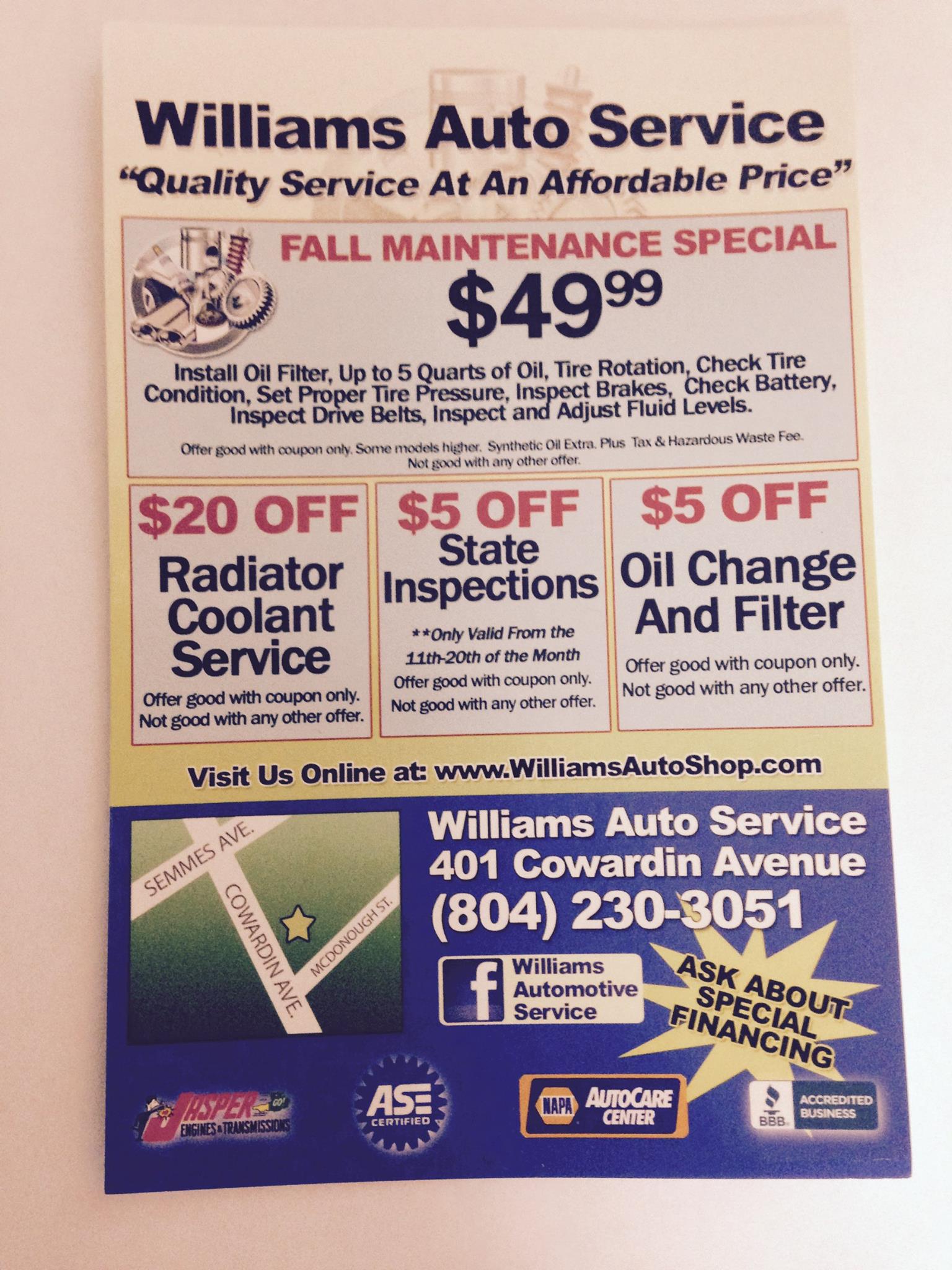 Williams Auto Service is a professional and knowledgeable auto shop. Customers report quick, efficient, and extremely fast service, often getting last-minute help. The staff is very friendly and maintains super clear communication. They use a helpful system that texts detailed invoices with pictures of needed repairs, so you can understand and approve work. They are trusted to do the job right with fair prices, ensuring you are not overcharged. Many have been loyal customers for years without complaint, returning for everything from tire patches to major repairs. They are absolutely and highly recommended for getting you out of a bind.