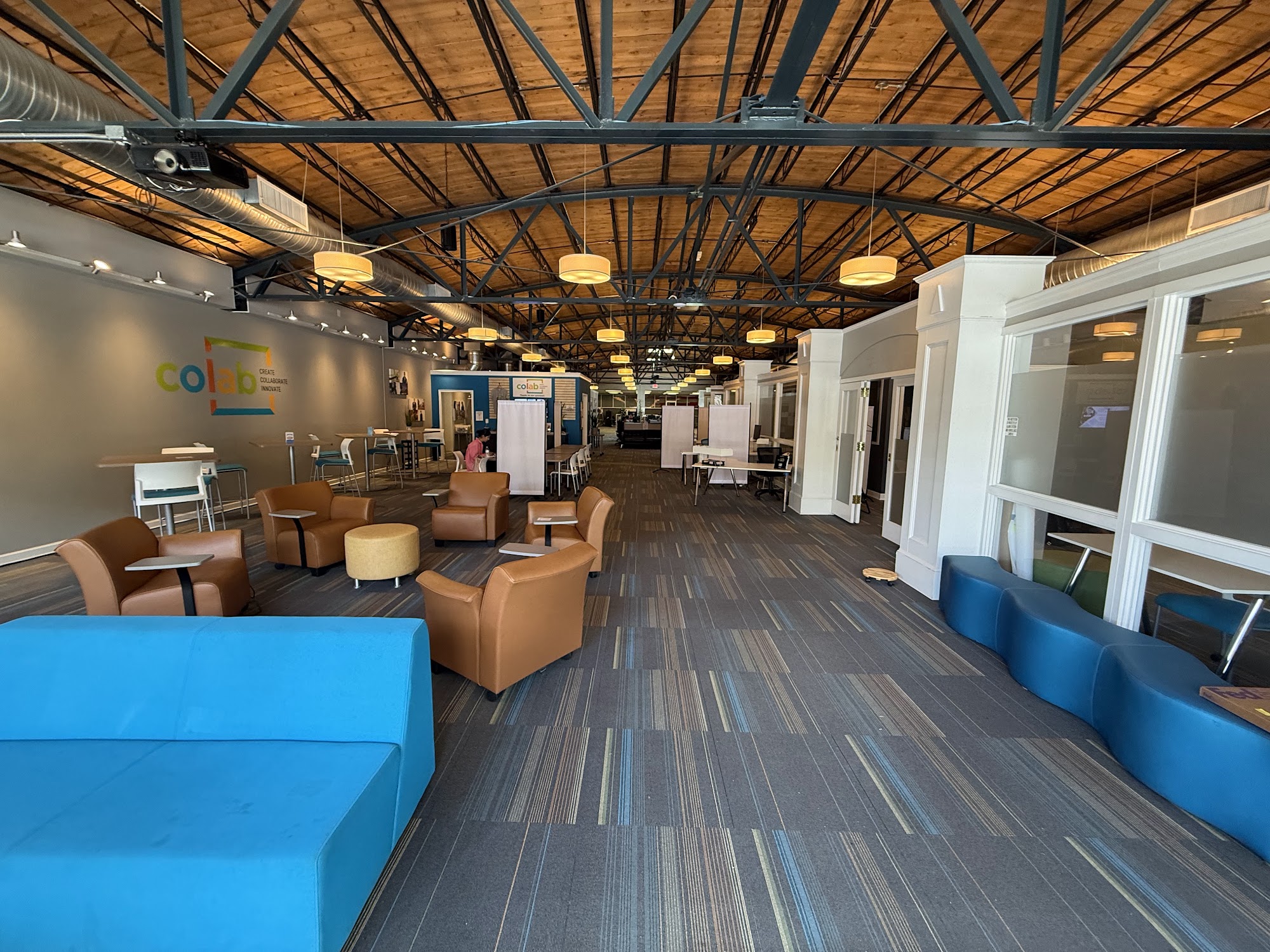 CoLab is a welcoming, comfortable, and clean coworking hub. It is a great place to work day in and day out, catering to solo working, private appointments, staff meetings, and social groups. The space has everything needed for a pleasant and productive work day, including great wifi, stocked coffee and tea, and a good interior. Members can reserve huddle rooms, conference rooms, a recording studio, and event space. Pricing is extremely clear and reservation emails are automatic. The doors are locked, creating a peaceful and secure environment. The people are great, helpful, and encouraging, striving to support local businesses. It is a collaborative and dynamic workspace for entrepreneurs, freelancers, remote workers, and small businesses.