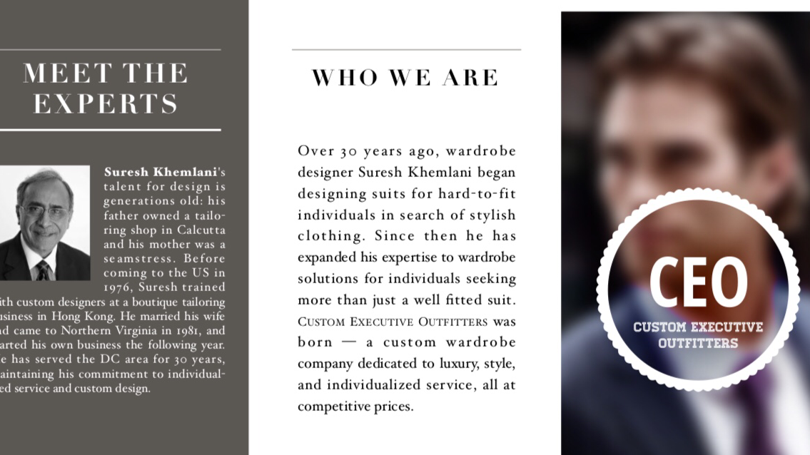 Exceptional service within my own home. Alterations were so good that I decided to order a custom suit and multiple shirts.Services: Design