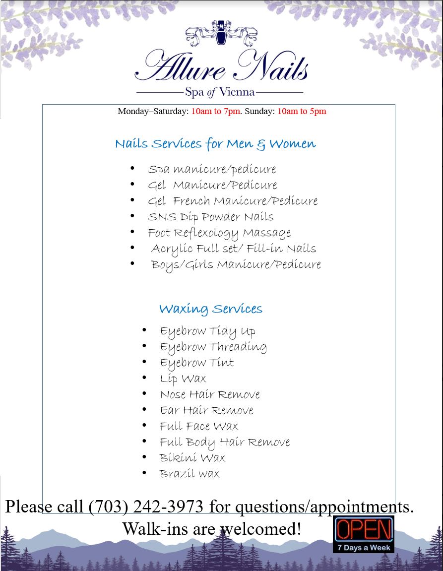 Allure Nails Salon, located at 117 Church Street NW, Vienna, VA 22180, offers high-quality beauty treatments in a welcoming environment. The salon prioritizes education, ensuring that each staff member is highly trained in products, techniques, and tools. This dedication to teamwork and innovation results in exceptional customer experiences. Reviewers praise the salon's attention to detail, with technicians like Srey Pao and Nita taking the time to understand clients' preferences and needs. The salon is known for its cleanliness and offers a range of services, including gel manicures, at affordable prices. Customers have highlighted the relaxing atmosphere, with one mentioning the comfortable massage chairs and personalized attention, including a dry manicure similar to a Russian manicure that turned out beautifully. The staff is friendly, patient, and friendly to children, making it a welcoming place for families. Clients appreciate the reasonable costs and the ability to get appointments quickly, sometimes just a couple of hours in advance. Overall, Allure Nails Salon is highly recommended for its exceptional service, friendly staff, attention to detail, and commitment to customer satisfaction.