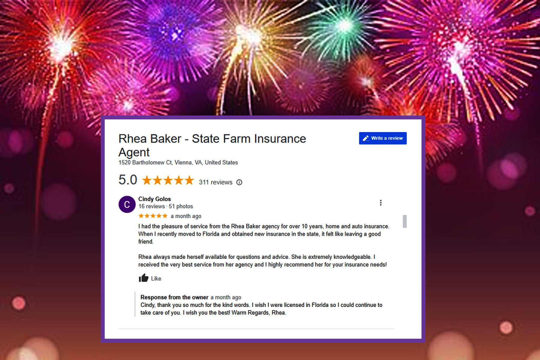 Rhea and her team were great in helping us transfer our policies from our original home state to Virginia. Rhea and her team were knowledgeable and responsive. I highly recommend Rhea and the entire State Farm family.