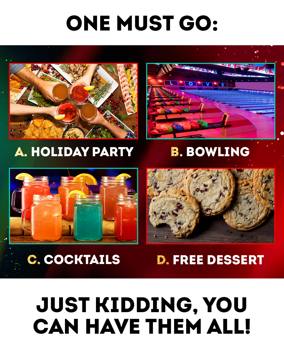 Bowlero is immersive entertainment at its best-the kind of interactive fun that lets you forget about everything and just enjoy the moment. When you roll in, you'll find a wonderful distraction in every corner of our hipster-inspired, retro-awesome venue. Bowl on blacklight lanes. Hit up our interactive arcade. Join a laser tag battle or traverse our ropes courses (at select locations). Or just explore the over-the-top culinary creations of our inventive menus.