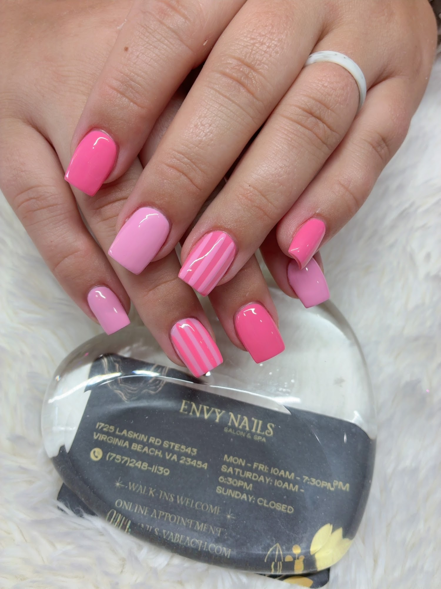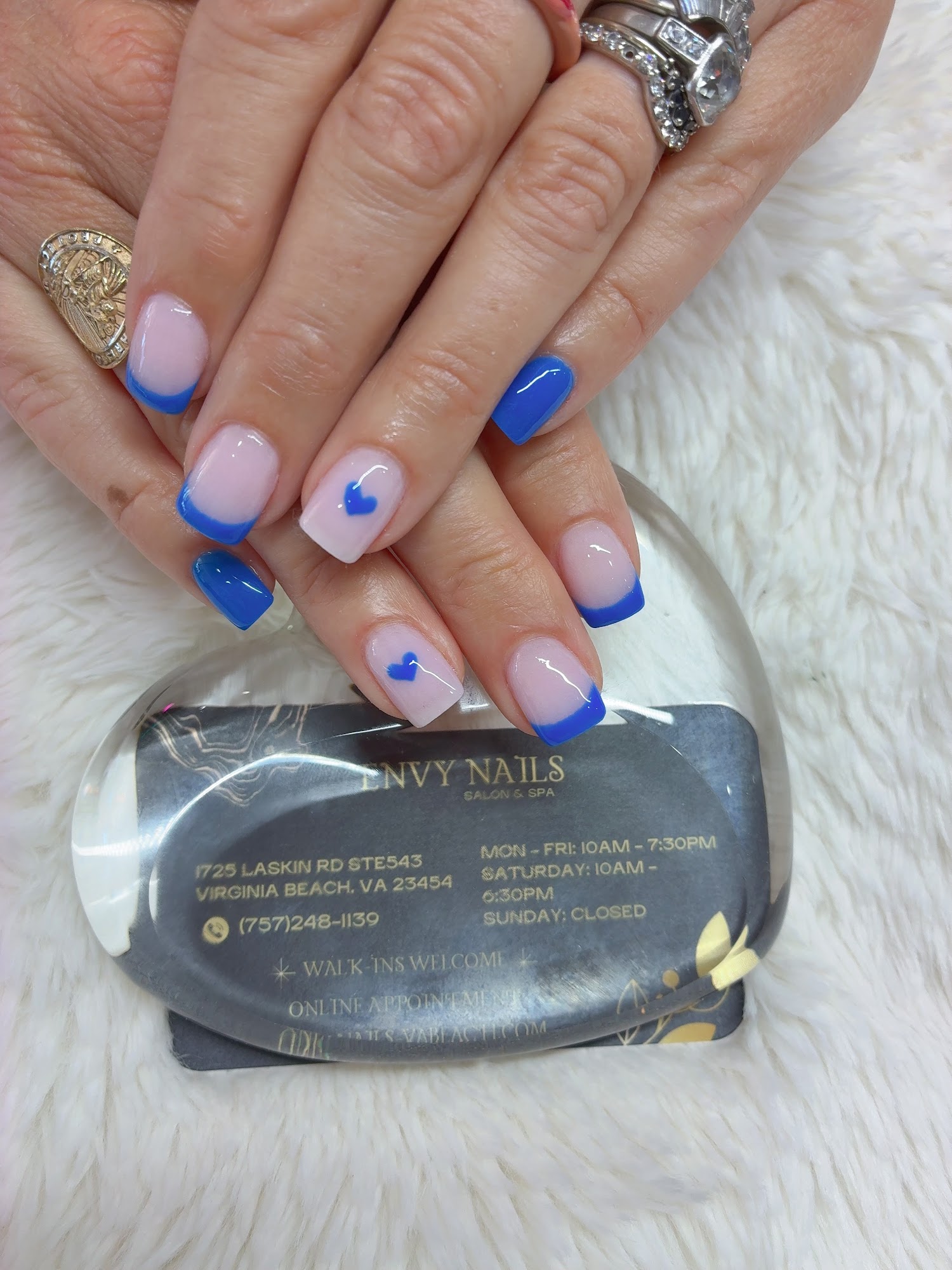 Our salon is conveniently located on Laskin Road in Hilltop, Virginia Beach (ZIP Code 23454). We prioritize cleanliness and hygiene by using new liners for every pedicure and sterilized equipment. Our friendly and professional technicians are ready to pamper you—come in, relax, and let us make your nails and toes beautiful for any occasion! **Appointments & Walk-ins are welcome. **Gift Cards & Special Discounts:** Rewards Program: Earn discounts with check-ins and reward points. Birthday Discount: 15% off services of $50+ with code BIRTHDAYATENVY25 (expires 12/31/2025). Bridal Discount: Brides receive 15% off services of $50+ when booking a group of 5up (discount applies to the bride only) with code BRIDEENVY25 (expires 12/31/2025)
