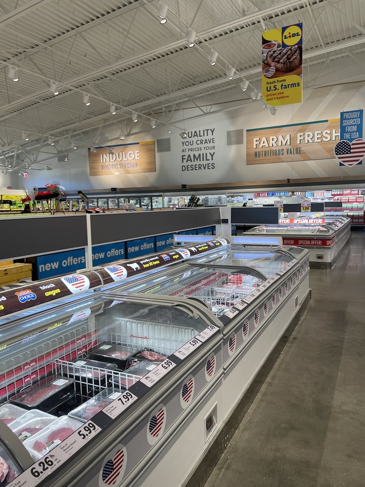 Lidl is a grocery store known for its high quality groceries at low prices. It offers a wide selection, including local produce, fresh meats and seafood, imported cheeses, European pastries, and weekly surprises. Many customers praise the unique and healthy options, solid brands, and overall freshness. The bakery is a highlight, with good, freshly baked bread and pretzels. However, the store has some noted drawbacks. The middle aisles can feel disorganized and are often dimly lit, making it hard to see labels. While there are unique items, they can be very seasonal, and the selection sometimes lacks basic staples. The main criticism involves checkout, with long lines due to few registers being open, especially since the removal of self-checkout. Some customers also find the staff unfriendly. Despite these issues, many appreciate the suspiciously low prices, the spacious layout, and the convenience of available shopping carts without a token system. It is described as a solid, larger-format store with plenty to choose from, particularly for German food and baked goods.