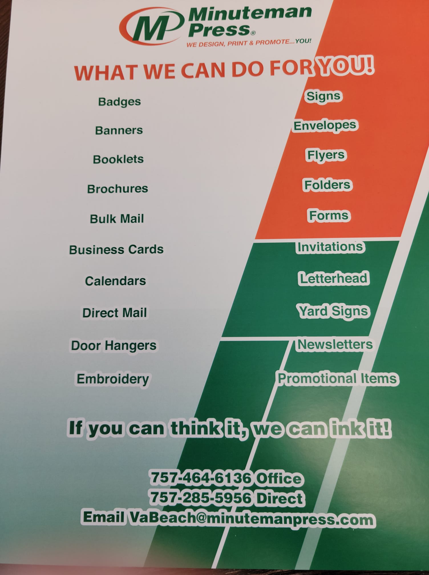 Bryan and his Team Are Phenomenal!!! They are reliable, efficient, professional and always accessible. I can count on them to provide me with good quality printing and would highly recommend using Minuteman Press Virginia Beach printing services.