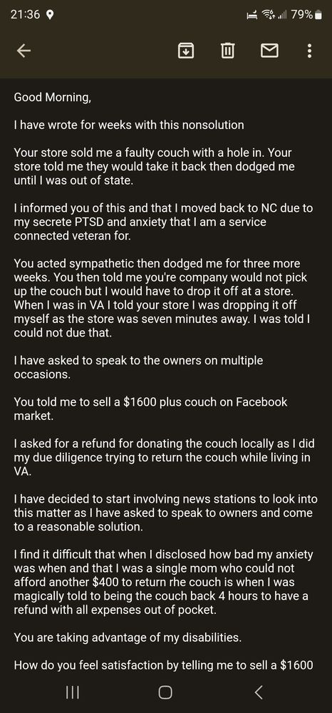 Had a great experience in store with Janelle. She wasn’t pushy, let us walk around on our own and checked in periodically to see if we had any questions. We purchased a new couch and had a quick delivery set up. Would definitely come back again when we need furniture in the future.