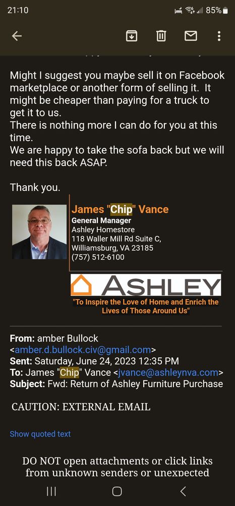 Aquazia is amazing! She helped me make huge decisions on what to pick for my lovely new living room, and dining room furniture. She is friendly and professional. I love my new Ashley pieces!